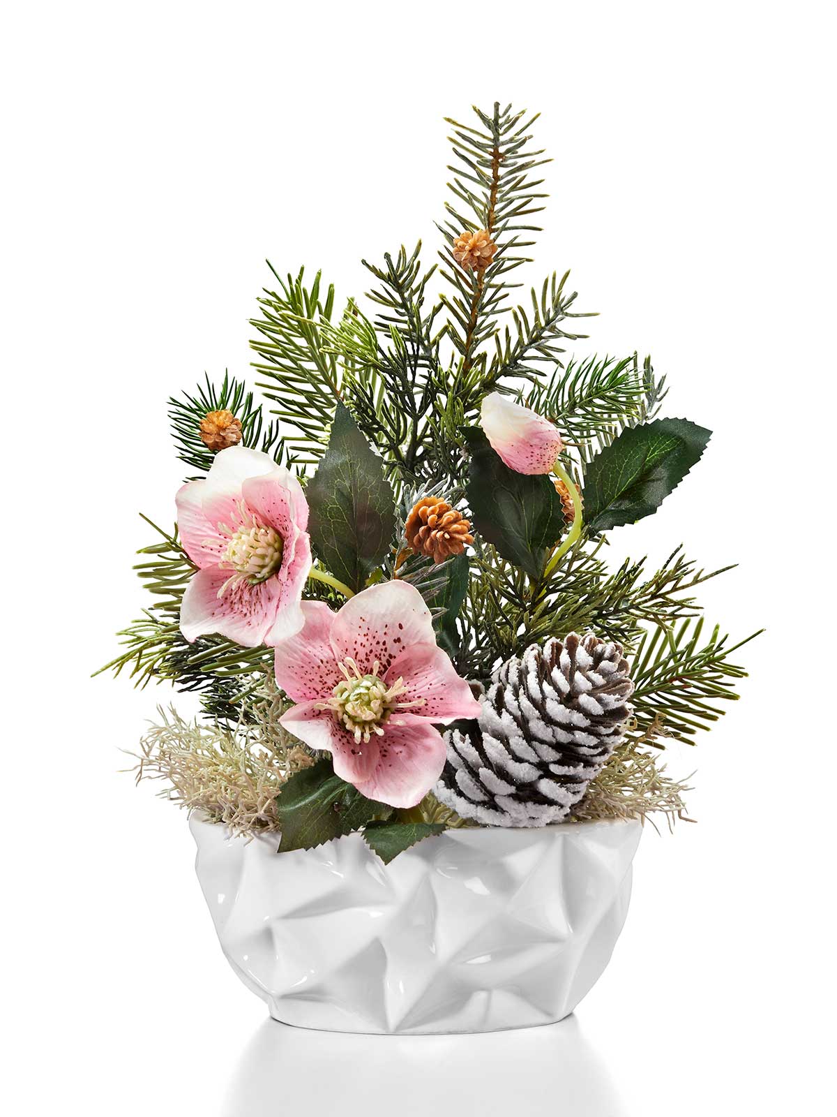 Ein prächtiger winterlicher Christrosen-Blumenschmuck, der immer für Sie blüht! Dieses bezaubernde Arrangement in einer aparten ovalen Porzellanschale verleiht Ihren Räumen einen Hauch Romantik! Es wirkt täuschend echt – mit dem entscheidenden Vorteil: Sie müssen sich um nichts kümmern und trotzdem gedeiht alles ganz von selbst! Schale: ca. 18 x 9 x 8 cm. Gesamthöhe: ca. 34 cm.