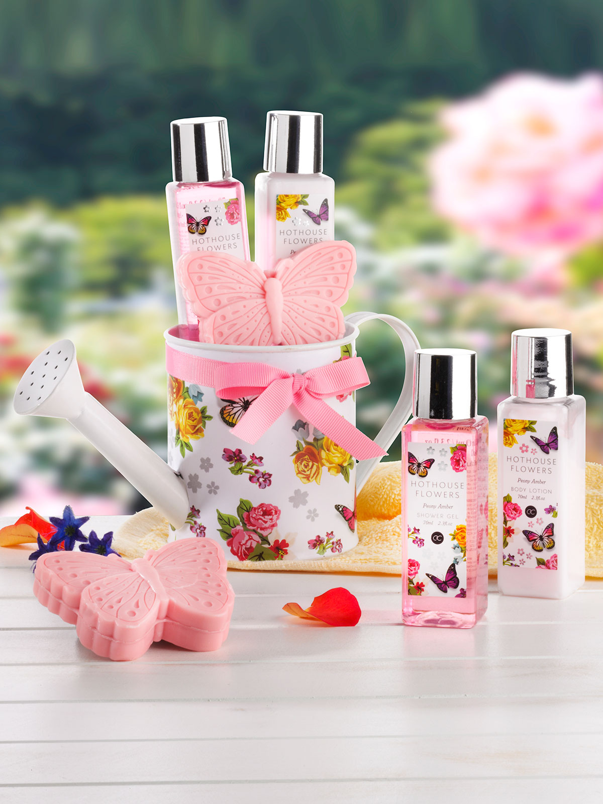 Das perfekte Geschenkset, ideal um anderen oder sich selbst eine Freude zu machen. In einer frühlingsfrischen Deko-Gießkanne stecken 70 ml zartreinigendes Duschgel, 70 ml Körperlotion und ein 60 g Seifenstück in Schmetterlingsform in der edlen Duftrichtung Pfingstrose-Bernstein. Darüber freut sich jede Frau! Höhe Metall-Deko-Gießkanne: ca. 10 cm.