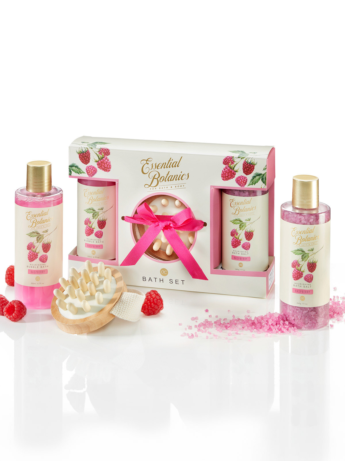 Das Verwöhnpaket für die Sinne! Mit diesen pflegenden Badezusätzen versinken Sie beim Baden in einem Meer aus duftendem Himbeerschaum. Die kleine Massagebürste aus Holz sorgt für geschmeidige Haut. Badeschaum: 200 ml. Badesalz: 260 g.