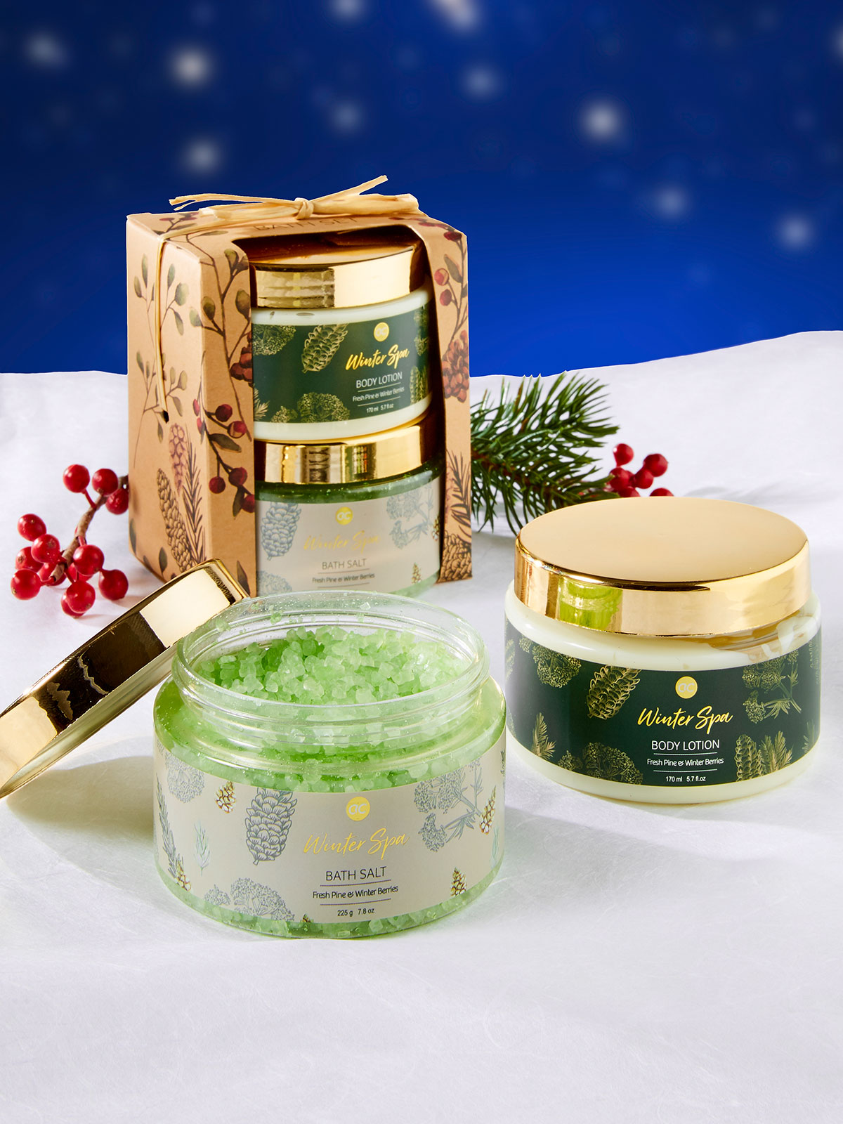 Geschenke erhalten die Freundschaft – dieses winterlich duftende Präsent-Set wird garantiert in sehr angenehmer Erinnerung bleiben. Den Inhalt der wunderschönen Geschenkverpackung bilden 170 ml Bodylotion und 225 g Badesalz in der Duftnote Frische Pinie und Winterbeere.