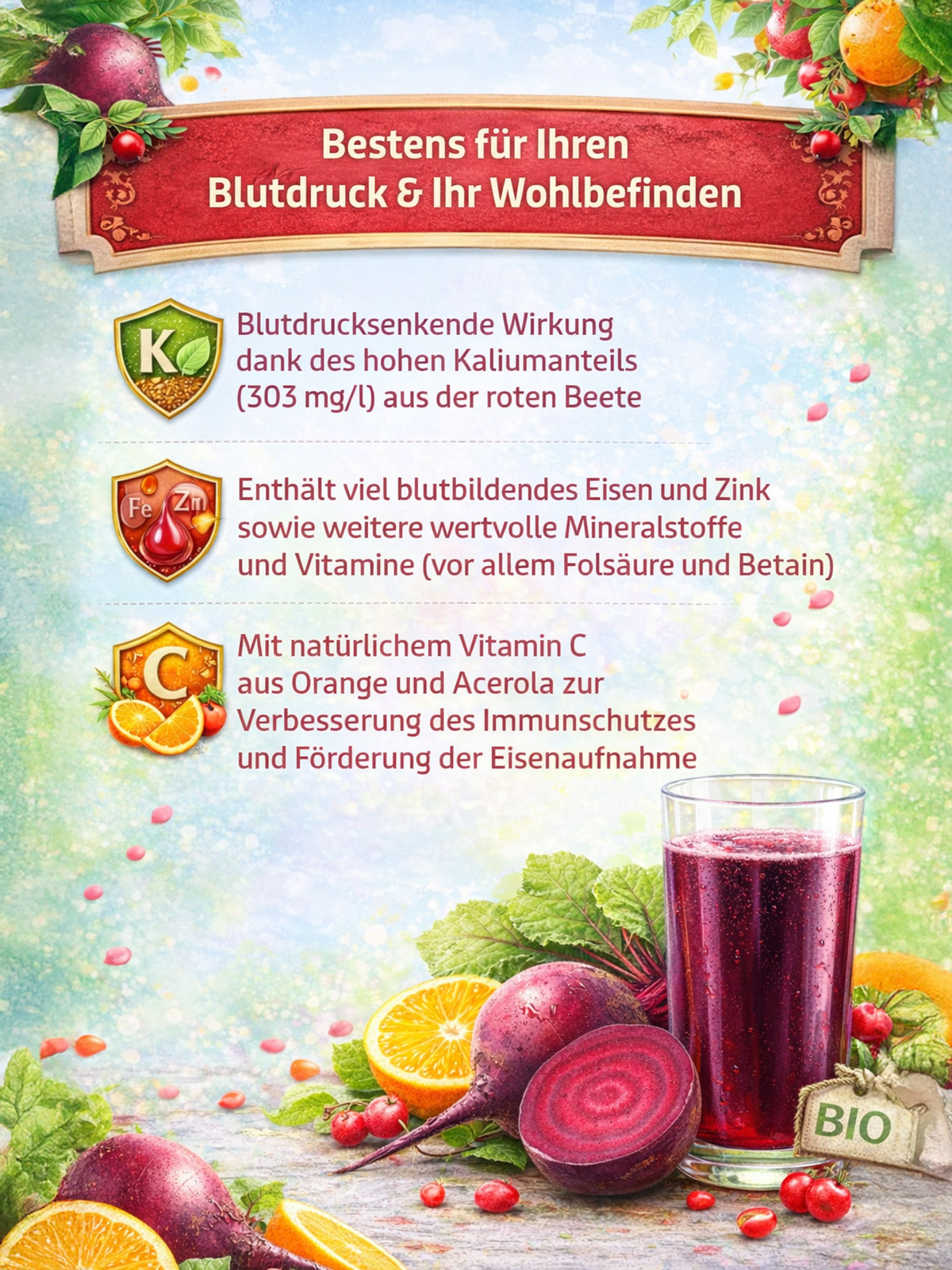 - Blutdrucksenkende Wirkung dank des hohen Kaliumanteils (303 mg/l) aus der roten Beete