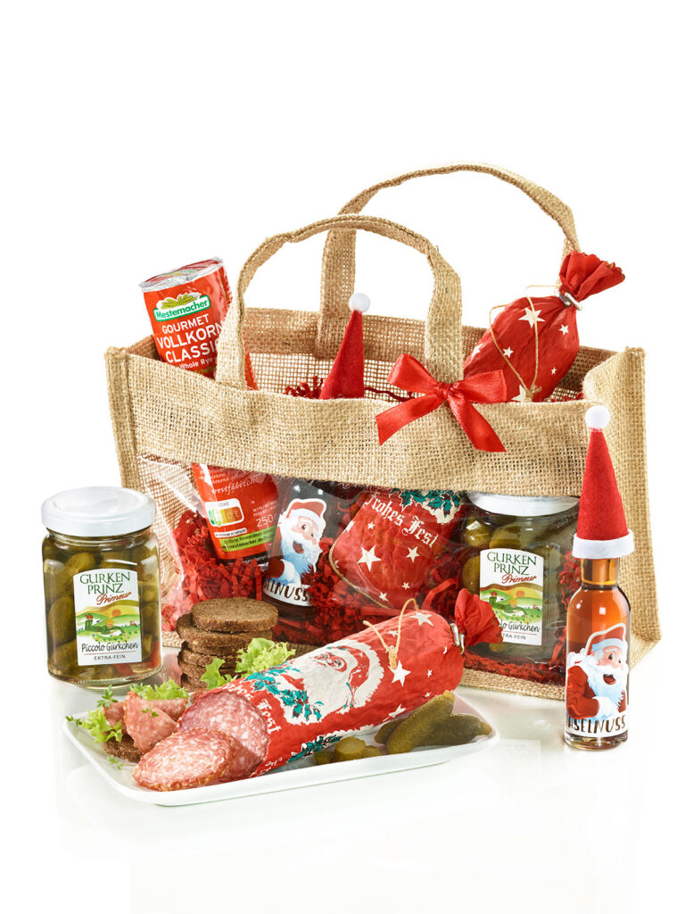 Weihnachtsmettwurst, Gourmet-Pumpernickel, Piccolo-Gürkchen aus Österreich & Haselnuss-Likör – fertig ist das Genuss-Geschenk! Foto: Jungborn.