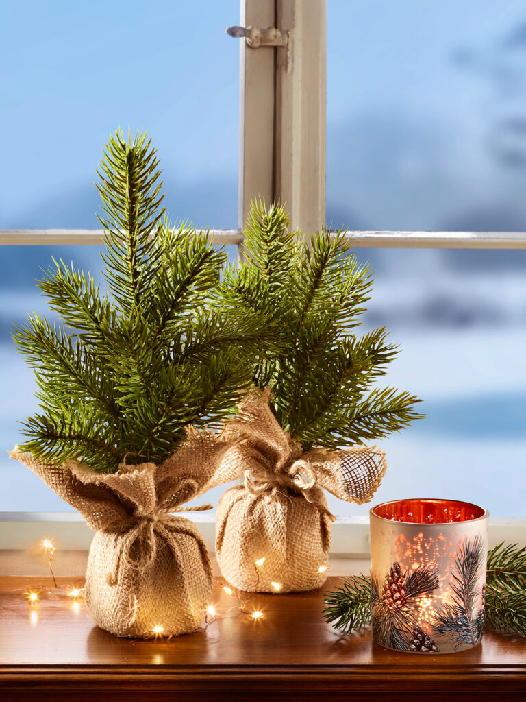 Perfekt für den Natur-Look 2025: Dekotanne im Jutesack und Teelichthalter „Winterglück“. Foto: Jungborn