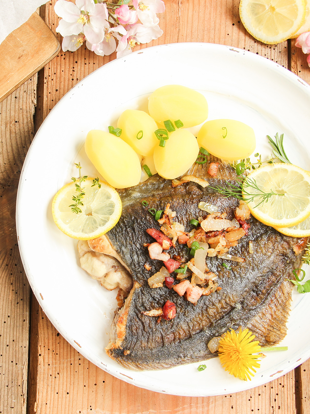 Dann die Schollenstücke auf ein Backblech legen, mit Speck und Zwiebeln belegen und mit Zitronensaft beträufeln. Für etwa 10-12 Min im Ofen garen.