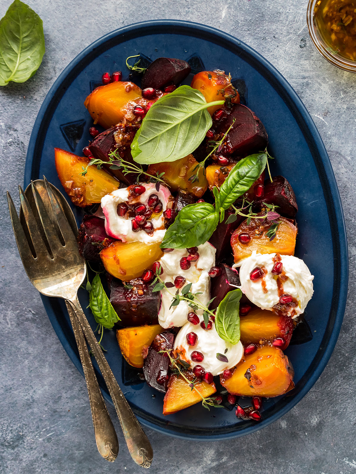 Kombinieren Sie für diesen Gericht am besten rote und gelbe Beete! Die runden Rüben übertreffen sich nicht nur im Geschmack, sie sind auch äußert nährstoffreich. Die Granatapfelkerne als knackiger, herb-süßer Geschmacksverstärker und ein Klecks Creme Fraîche oder Ricotta als Frischekontrast runden dieses wunderbare Wintergericht perfekt ab.