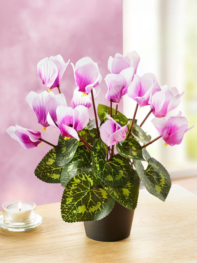 Zarte Blütenpracht, die nie verblüht: das Kunstblumen-Alpenveilchen „Violetta“. Foto: Jungborn