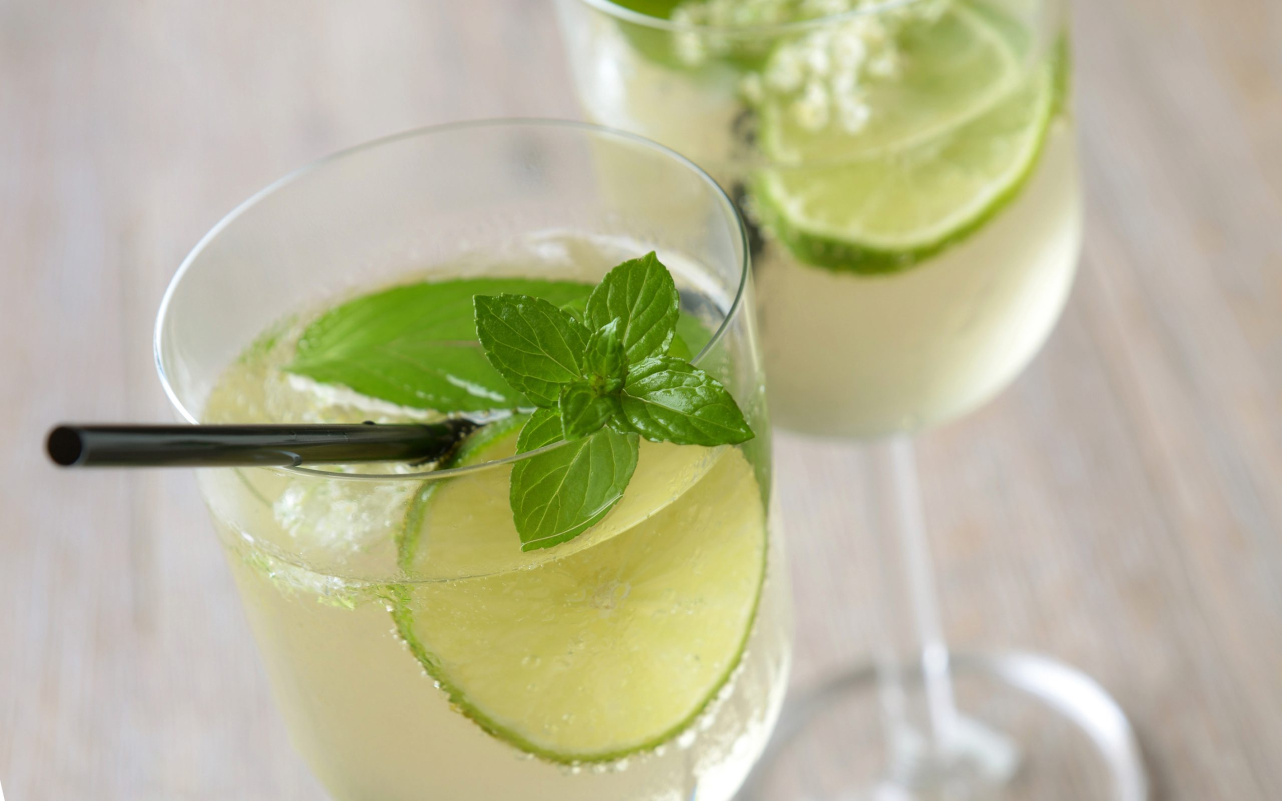 Die Limette halbieren und den Saft herauspressen. In einem Glas die gewaschenen Minzeblätter etwas zerquetschen. Holunderblütensirup und Limettensaft dazugeben und etwas verrühren. Das Glas mit Prosecco und Soda auffüllen und etwas Eis beigeben.