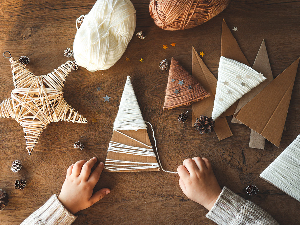 Zaubern Sie Sterne, Tannenbäume oder Engel im kuscheligen Woll-Mantel! Dafür schneiden Sie die gewünschten Formen einfach aus dickem Papier oder Karton aus und umwickeln sie kunstvoll mit den Wollfäden. Die Fäden ein bisschen mit Kleber fixieren, an den Baum hängen oder stecken – so wird der gemütliche Natur-Look perfekt!