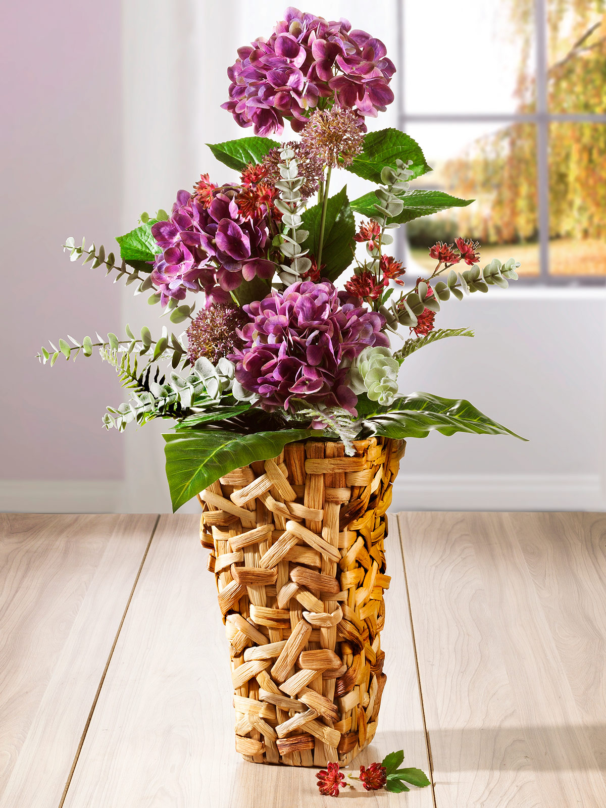 Holen Sie sich diese romantische Gartenschönheit ins Haus. Ein wirklich naturgetreues Arrangement mit Hortensien, Allium, Eukalyptus und wunderschönem Blattwerk aus täuschend echtem Kunst- und Textilmaterial bleibt das ganze Jahr über grün. Die traumhaft schönen Pflanzen sind dekorativ in einen Topf aus Schilfblatt eingesetzt. Wird in einem separaten Paket geliefert! Höhe: ca. 80 cm.