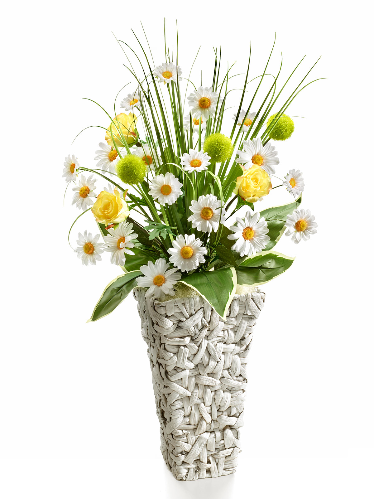Ein Blütenmeer aus weißen Margariten mit edlen gelben Rosen! Das prächtige Arrangement aus kunstvollen, wie echt wirkenden Rosen, Allium, Margeriten, Gräsern und Funkienblättern wird fest in eine dekorative, weiße Vase aus Schilfblatt eingesetzt. Ob in einer Raumecke oder an einem sonnigen Platz – pflegeleichter geht es kaum! Wird in einem separaten Paket geliefert. Höhe insgesamt: ca. 80 cm.