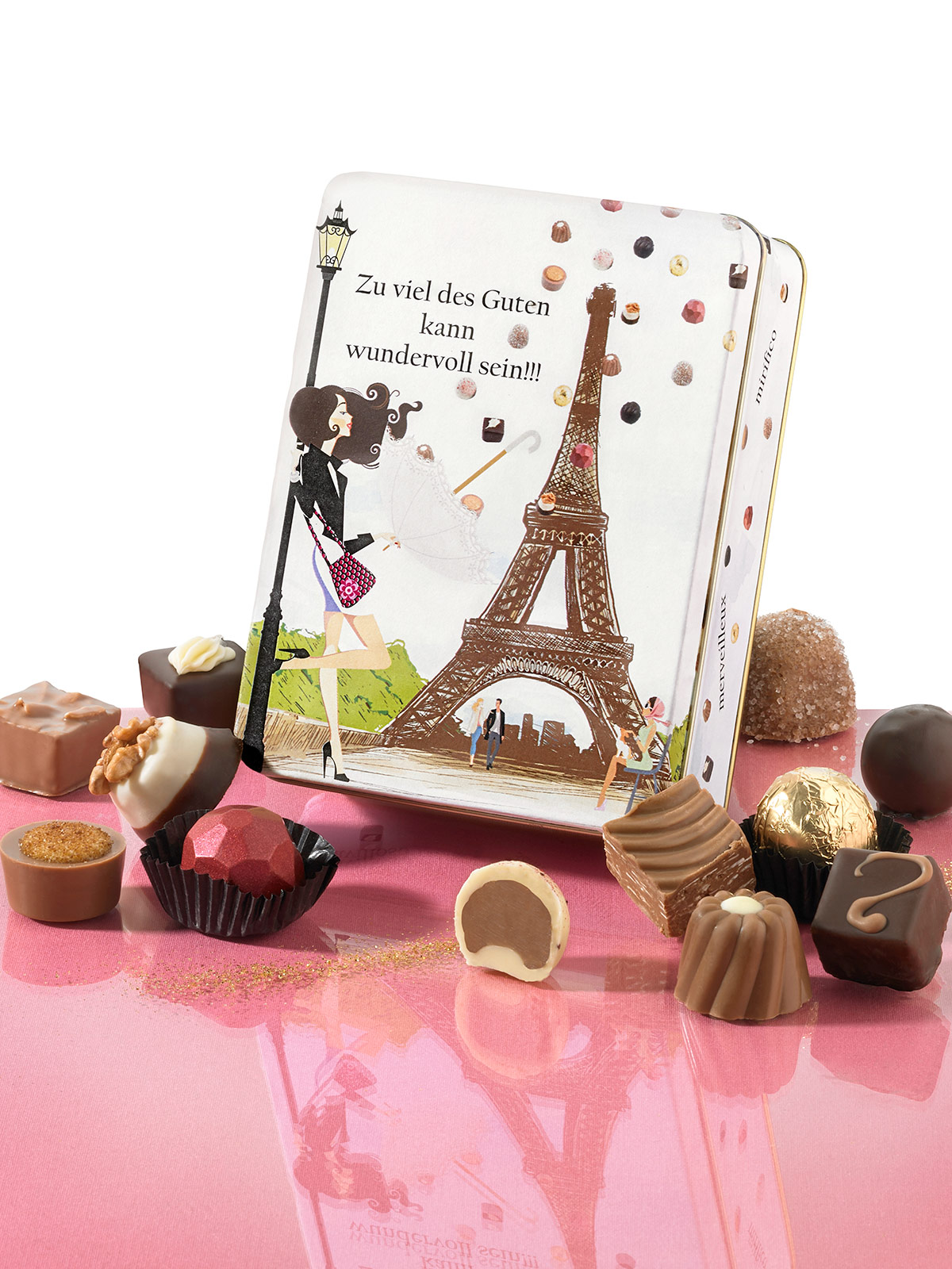 Zu viel des Guten kann wundervoll sein: „Denn geschenkt macht nicht dick“!!! Verwöhnen Sie sich oder einen lieben Menschen mit dieser Pralinendose, wenn einfach mal alles schief geht! Geschmacksvielfalt und die liebevolle Gestaltung bringen das Lächeln ins Gesicht zurück. Ideal als Geschenk, um Mitgefühl und Anteilnahme für jemanden zu zeigen, der es gerade braucht. Zudem enthält die geprägte Pralinen-Dose gefüllt mit edlen Pralinen und Trüffeln, feinste Confiserie-Kunst. Leicht mit Alkohol verfeinert. 150 g.