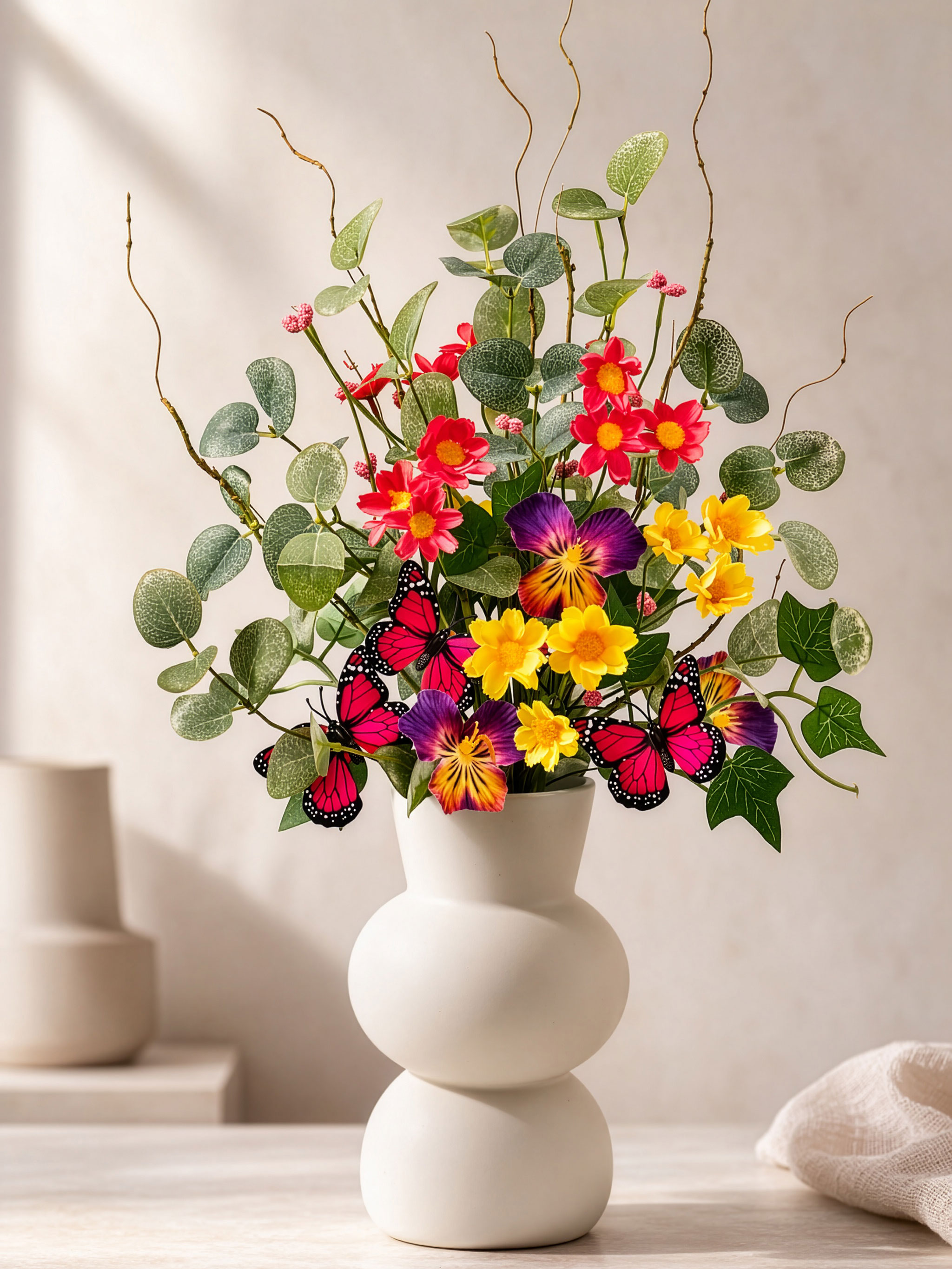 Wunderschöner Blüten-Blätter-Mix fürs vielseitige Dekorieren! Ob einzeln oder als Strauß: Verschönern Sie Ihre Räume mit diesen zauberhaften, wie echt wirkenden 4 Deko-Stielen. Auch schön für ein Geschenk. Material: Kunststoff, Polyester. Höhe: ca. 28 cm.