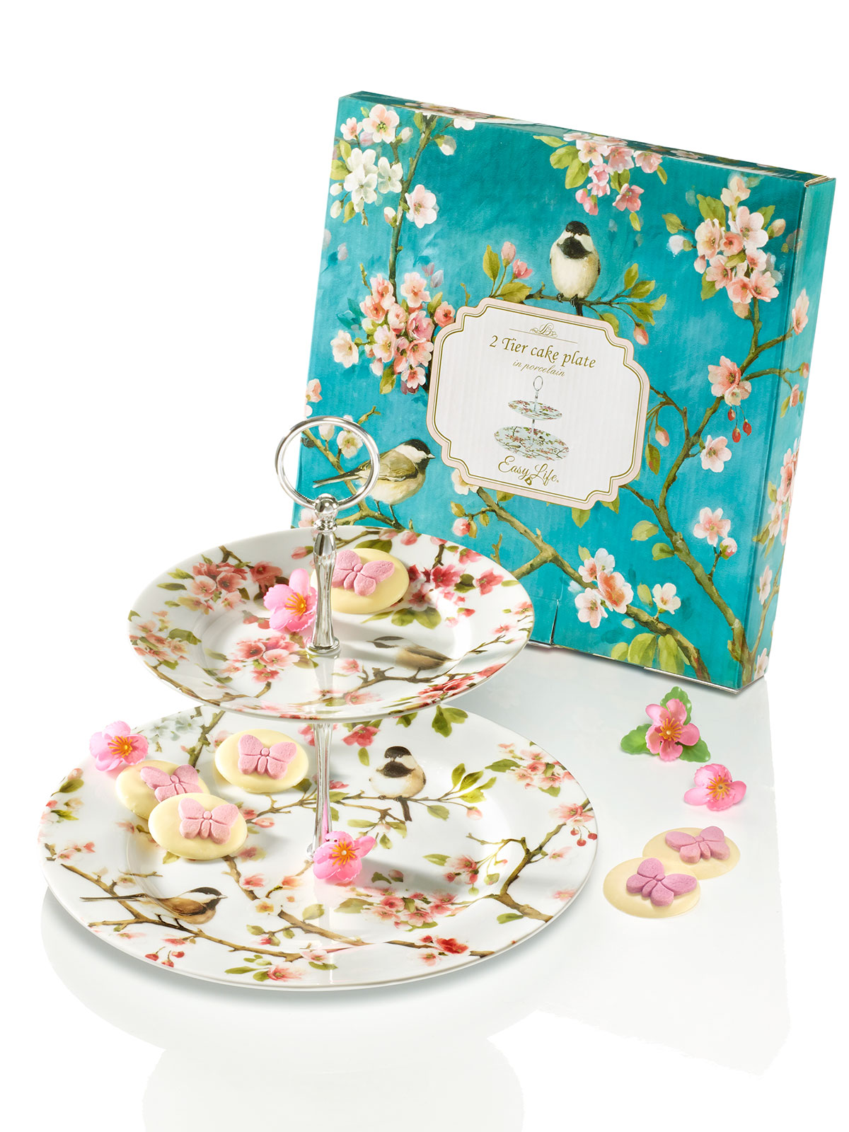Traumhaft romantische Etagere im Kirschblüten-Design mit kleinen Vögelchen. Hier wird jedes Törtchen und jede Praline geadelt! Material: Porzellan, Metall. Bitte von Hand spülen. Platten: Ø ca. 27 und 19 cm. Höhe: 24 cm.
