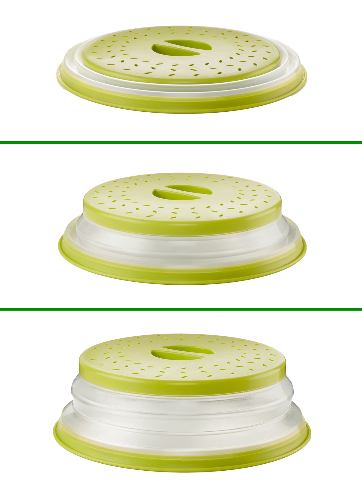 Faltbar in 3 Höhen und platzsparend zu verstauen – hält Ihr Mikrowellengerät garantiert sauber! Das speziell entwickelte Lüftungssystem der Haube sorgt für die schonende Zubereitung der Speisen. Material: Kunststoff. Handwäsche empfohlen. Ø : ca. 27 cm.