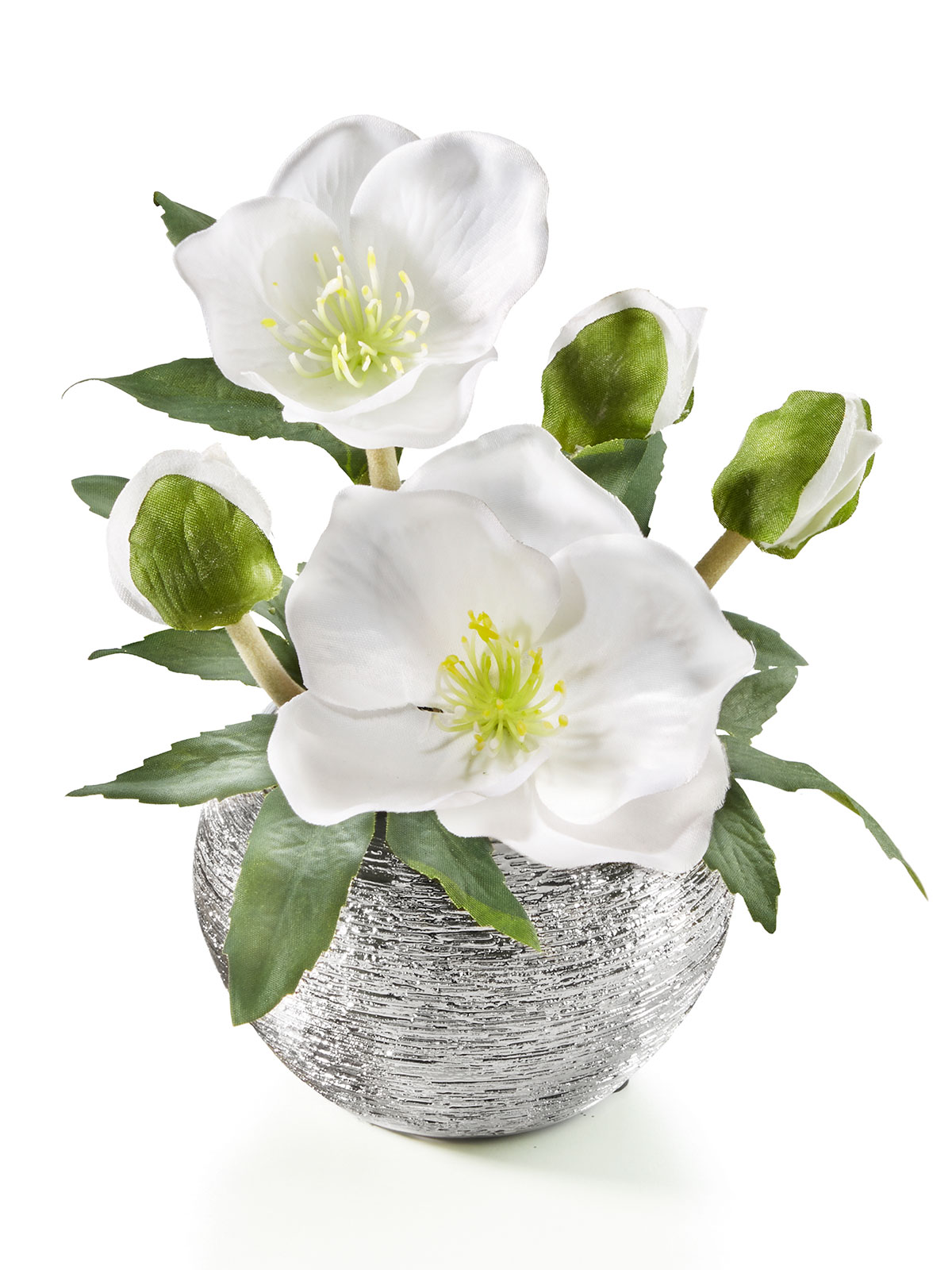 Im edel-silbernen Keramiktopf! Als stilvoller Tischschmuck fasziniert die pflegeleichte Kunst-Christrose dank ihrer natürlichen Ausstrahlung jeden Tag aufs Neue. Der Keramiktopf in Silber unterstützt die edle Optik. Material: Textil, Keramik. Mit Tischschonerfüßchen. Höhe: ca. 17 cm.