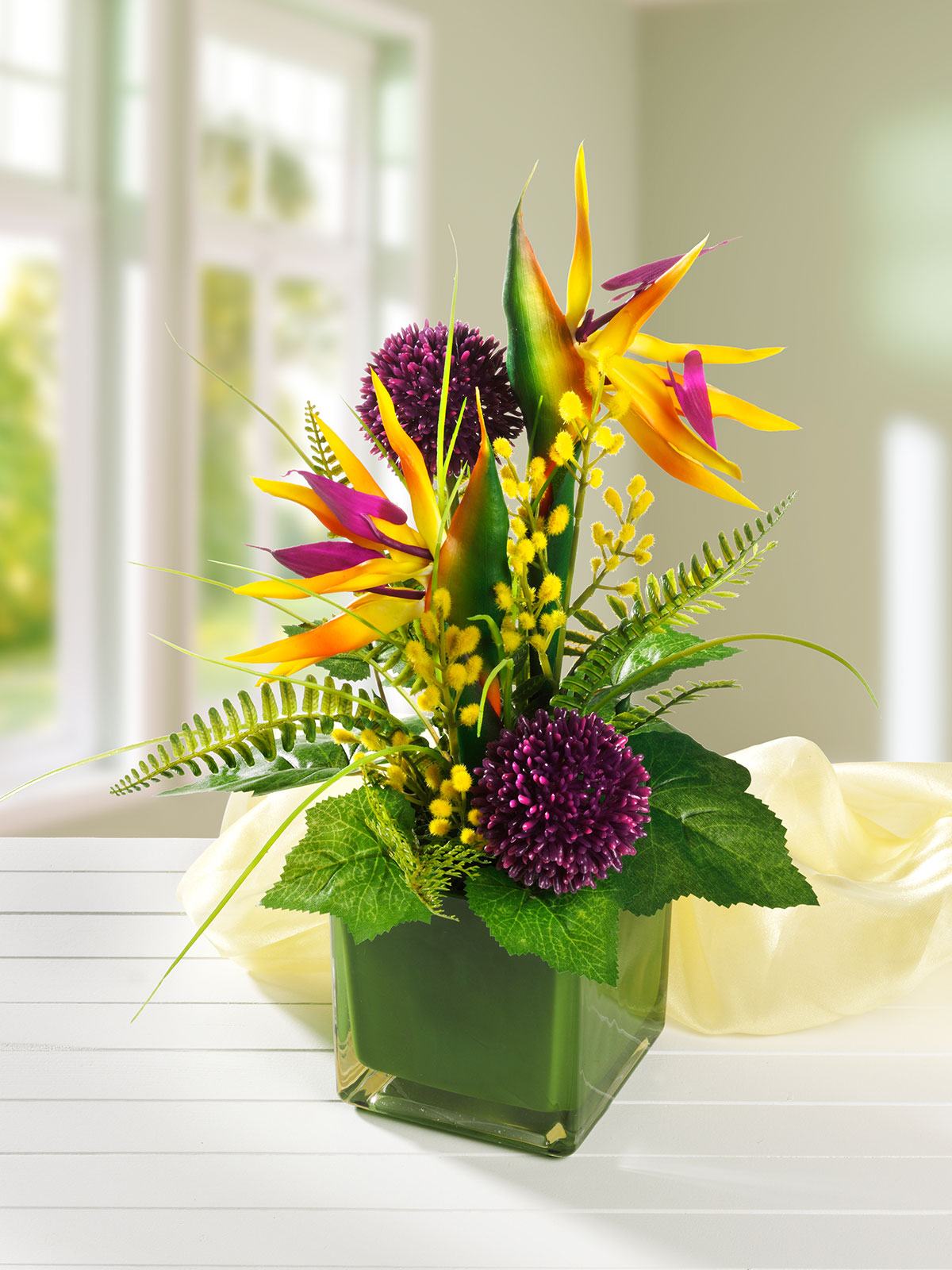 Holen Sie sich den ewigen und exotischen Sommer ins Haus! Frische Farben wurden in diesem Gesteck vereint. Mit Strelitzien, Allium, gelben Blumen sowie grünem Beiwerk geschmückt. Fest in einen grünen Glastopf eingesetzt. Aus Kunst- und Textilmaterial gefertigt. Höhe: ca. 35 cm, Topf: ca. 12 x 12 x 12 cm.