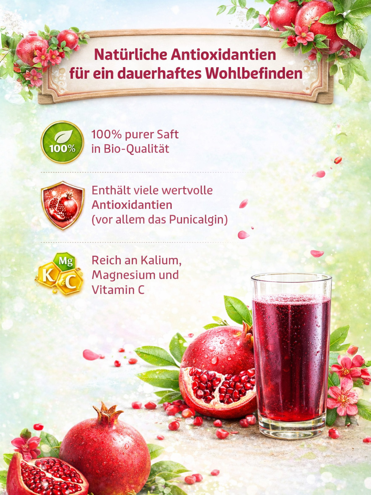 Der Granatapfel ist eine wahrhaft paradiesische Frucht! Damit Sie dauerhaft von den positiven Eigenschaften des Granatapfel Bio-Saftes mit vielen guten antioxidativen Inhaltsstoffen profitieren können, empfehlen wir ein Glas (200 ml) pro Tag.