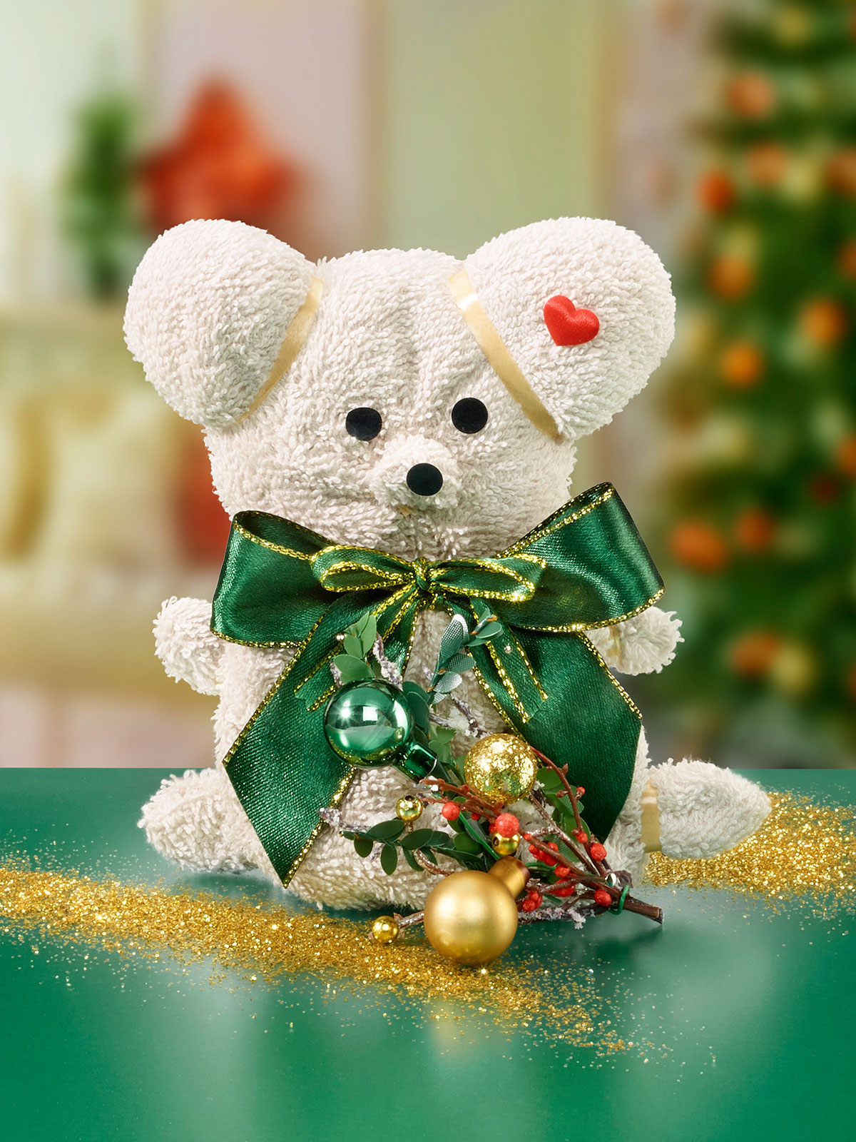 Sowohl durch seine absolut ausgefallene, weihnachtliche Optik, als auch durch seine Qualität ist dies eine sehr originelle und überzeugende von Hand gefertigte Geschenkidee. Ein Gästehandtuch (30 x 50 cm) liebevoll mit Schleifenband und kleinen Kugeln zum Teddy gebunden und mit einem kleinen Herz am Ohr dekoriert. Material aus 100 % Baumwolle, bei 60 °C waschbar. Maße: ca. Höhe: ca. 15 cm.