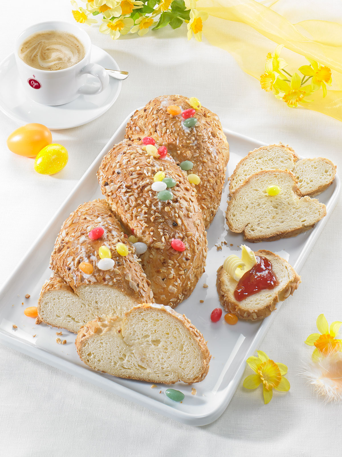 Ein süßer Hefezopf gehört zu Ostern einfach dazu! Dieser samtig-weiche, handgewickelte Hefezopf ist ein stattlicher Hingucker auf jedem Buffet. Mit bunten Drageeeiern, gehackten Mandeln und Nüssen, sowie einem leichten Zuckerguss belegt und mit viel Liebe gebacken – Der wird Ihnen und Ihrer Familie garantiert schmecken! Ab dem Versanddatum ca. 4 Wochen haltbar. 500 g.