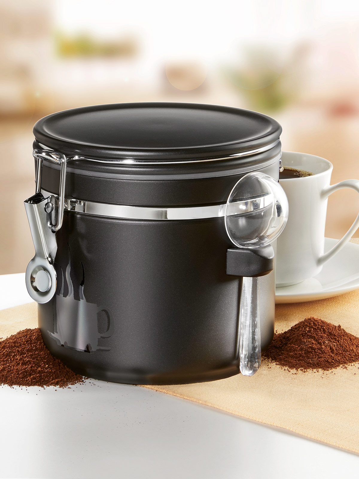 Ein edler, metallisch-schwarzer Kaffeebehälter mit praktischem Bügelverschluss. Durch ein Fenster lässt sich immer sehen, ob noch genügend Kaffee im Behälter ist. Mit Gratis-Kaffeemaß. Material: Kunststoff. Ø 13 cm, Höhe: 12 cm. Fasst ca. 500 g Kaffee.
