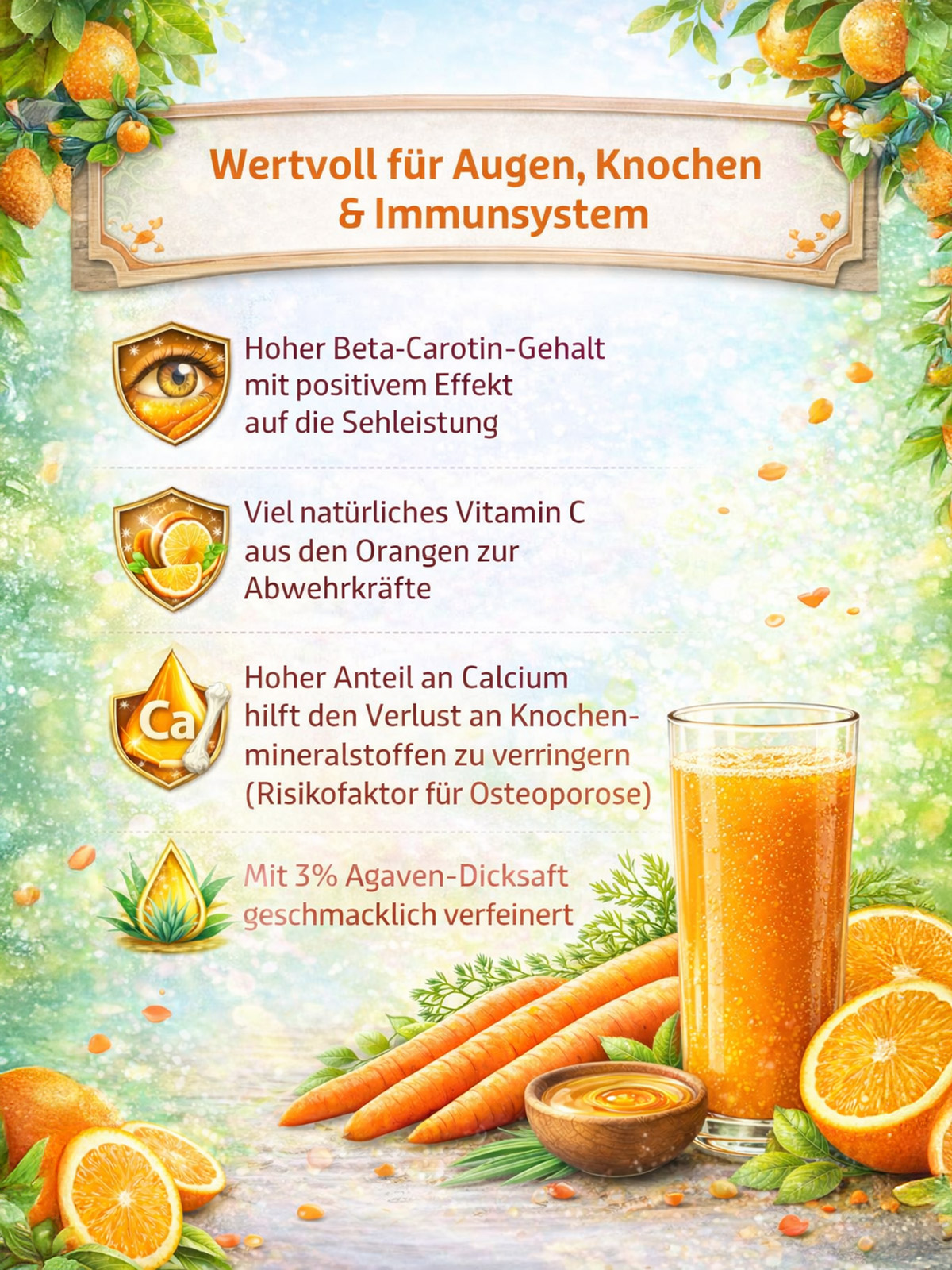 Der hohe Beta-Carotin-Gehalt hat einen positiven Effekt auf die Sehleistung. Viel natürliches Vitamin C aus den Orangen stärkt die Abwehrkräfte und der hohe Anteil an Calcium in einer Flasche deckt zu 100% den Tagesbedarf eines Erwachsenen. Calcium wird für die Erhaltung normaler Knochen und Zähne benötigt. Eine geringe Knochenmineraldichte ist ein Risikofaktor für Osteoporose.