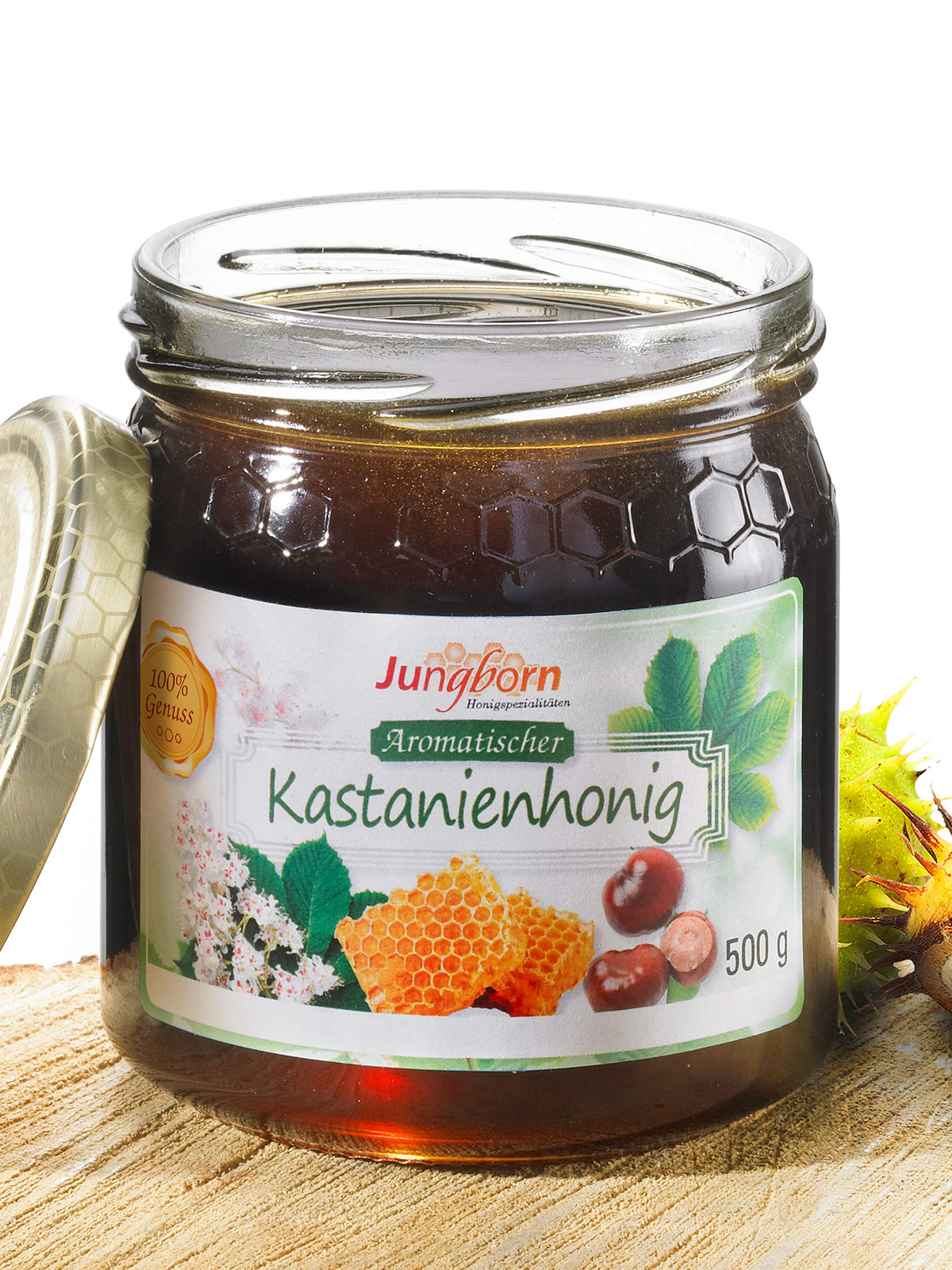 In den Kastanienwäldern Spaniens sammeln die Bienen Nektar und Honigtau der Edelkastanien und bereiten daraus einen von herb-würzigem Aroma geprägten Honig. Die Farbe des Kastanienhonigs schimmert wie dunkler Bernstein, der Duft ist kräftig und leicht herb, die Konsistenz aufgrund des hohen Gehalts an natürlichem Fruchtzucker dauerhaft flüssig. Kastanienhonig ist die ideale Zutat für Balsamico-Vinaigrettes und passt zu vielen Fleischsorten. 500-g-Glas.