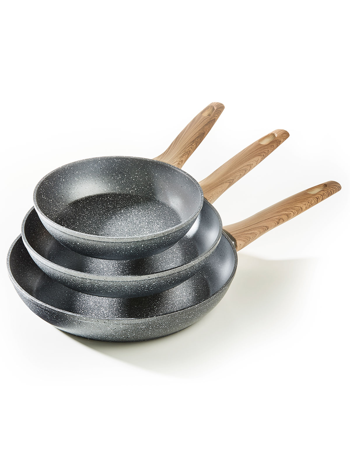 Diese Aluminium-Pfannen mit Griffen in Holz-Optik machen es Ihnen leicht! Aufgrund der langlebigen Keramikbeschichtung ideal zum Braten und Kochen – nahezu ohne Fett! Optimale Wärmeleitfähigkeit und energiesparende Hitzeverteilung. Kratzunempfindliche Keramikbeschichtung mit Abperleffekt. Für alle Herdarten geeignet. Ca. Ø 20, 24 und 28 cm.