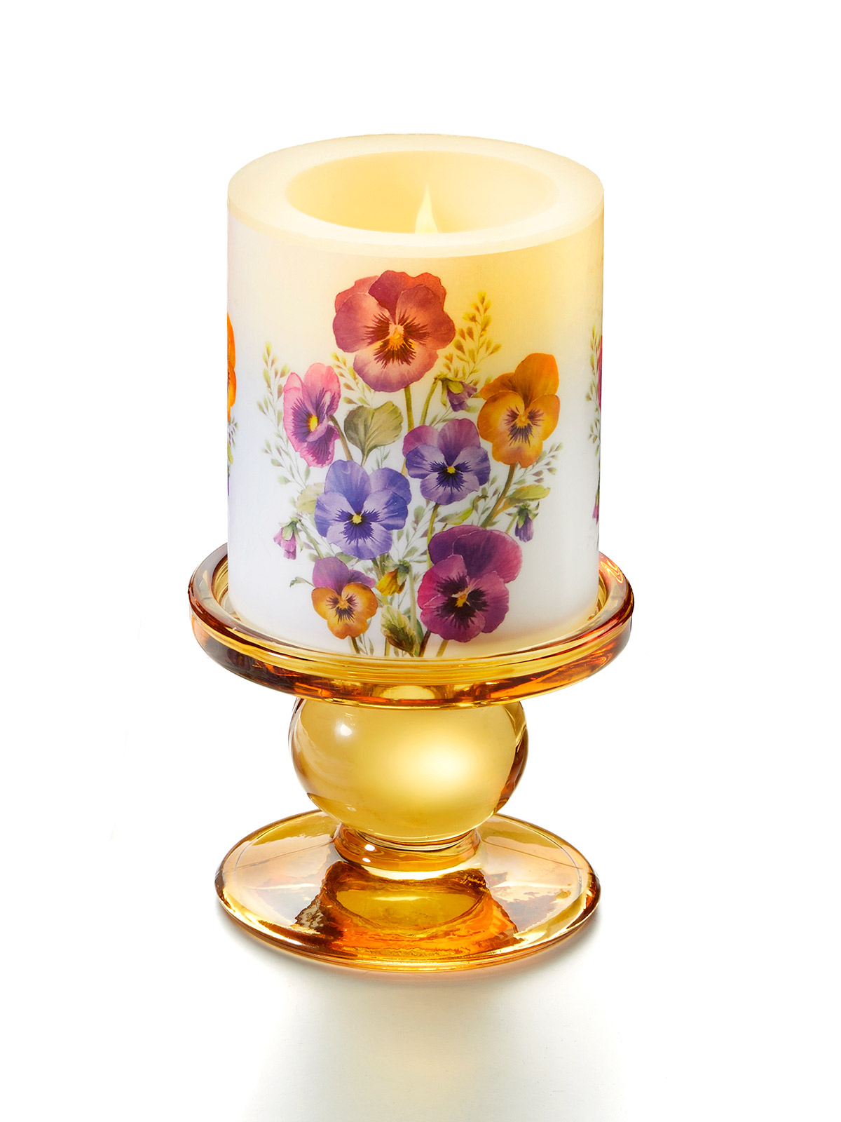 Zauberhaftes Blütenmotiv & Lampion-Effekt! Diese edle Echtwachs-Kerze mit den farbenfrohen, zarten Stiefmütterchen brennt von innen herunter, sodass der durchscheinende Rand wie bei einem Lampion stehen bleibt. Ein stimmungsvoller Effekt! In Folie hübsch verpackt – ideal als Geschenk! Kerzenständer nicht im Lieferumfang enthalten. Ø ca. 7,5 cm. Höhe: ca. 9 cm.
