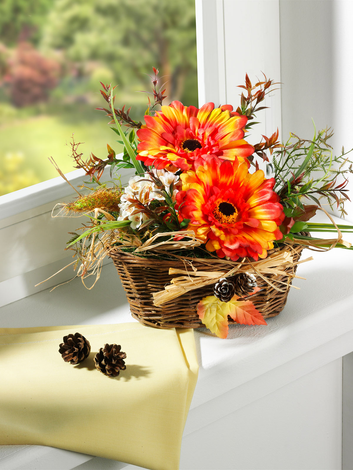 Dauerfreude durch Dauerblüher! In diesem entzückenden, mit Zapfen und Laubblättern verzierten, Weidenkorb wurden prächtig leuchtende Gerberas zusammen mit kleinen, weißen Blüten und grünem Beiwerk eingesetzt. Aus hochwertigem Kunst- und Textilmaterial hergestellt. Maße: ca. 33 x 20 cm.