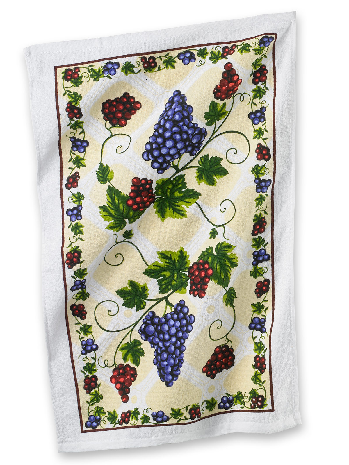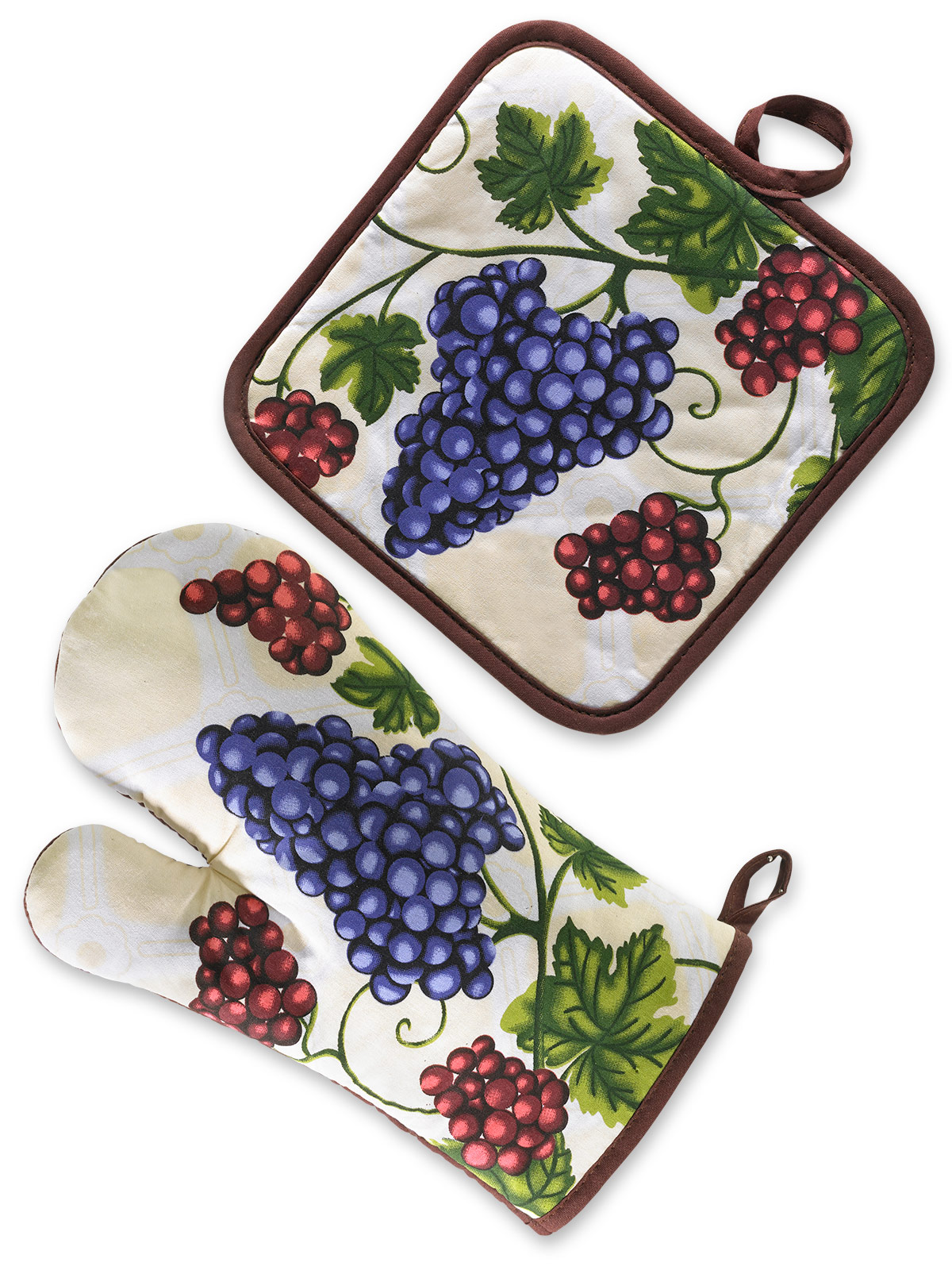 Ein „Muss“ in jeder Küche! 1 Ofenhandschuh in Premium-Qualität, dicke Baumwolle beschichtet, für die extrem sichere Handhabung von warmen Speisen: ca. 16 x 26 cm, 1 Frottee-Küchenhandtuch: ca. 40 x 60 cm und 1 Topflappen: ca. 20 x 20 cm. Alles im wunderschönen „Trauben-Design“. Gleich sichern!