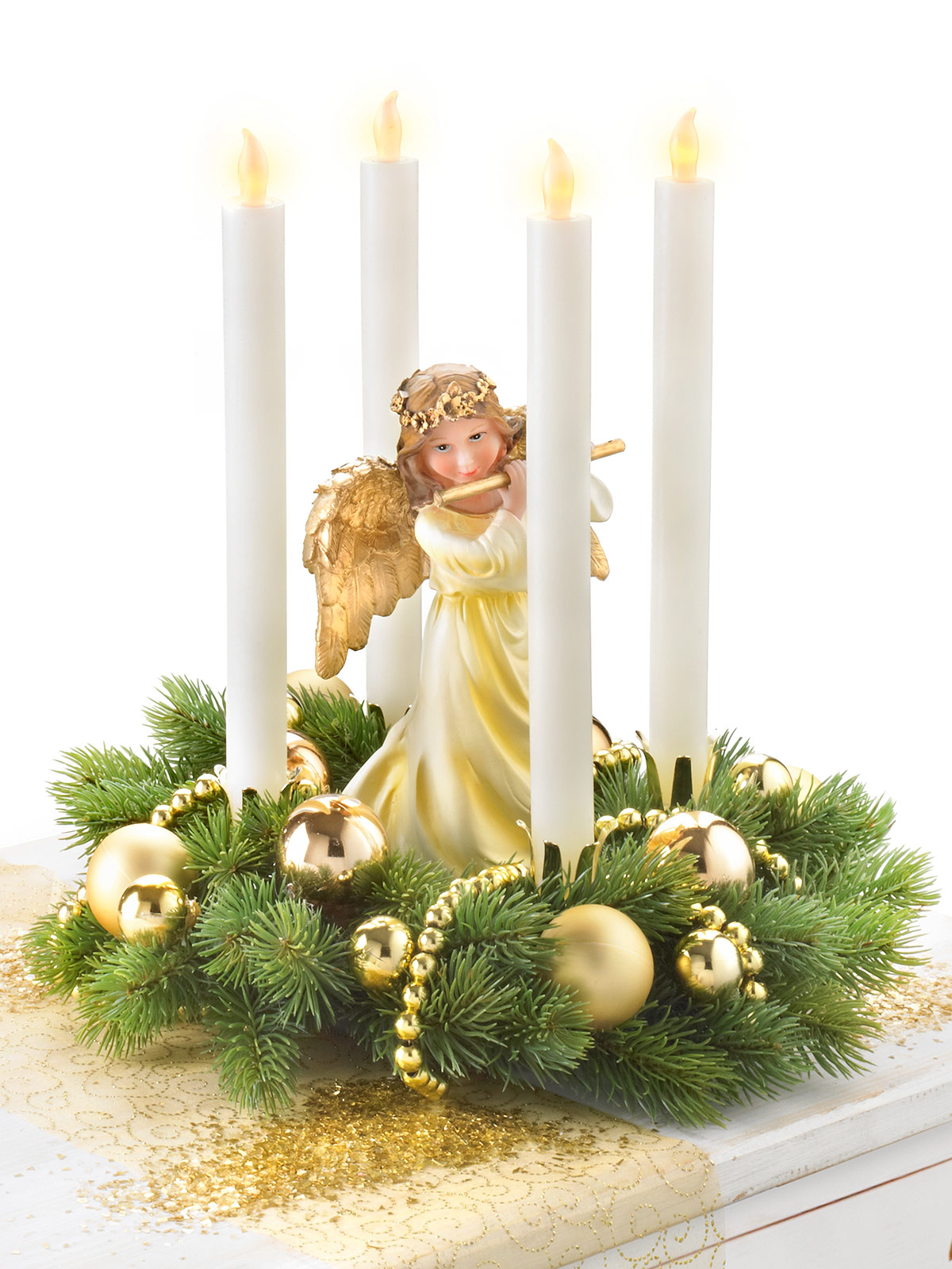 Weihnachtlichen Glanz verbreitet dieser Adventskranz mit seinen 4 LED-Echtwachs-Stabkerzen in Tropfenoptik. Auf einen Kranz aus Styropor sind Tannenzweige sowie goldfarbene Kugeln und Perlen aus Kunstmaterial aufgebracht. In der Mitte ziert das Ganze ein bezaubernder Engel mit Flöte aus Polyresin. Kerzen batteriebetrieben mit je 2 x AA, 1,5 V (nicht im Lieferumfang enthalten). Tipp: am besten gleich mitbestellen. Kranz ca. Ø 32 cm, Engel Höhe: ca. 21 cm, Kerzen je Höhe: ca. 23 cm.