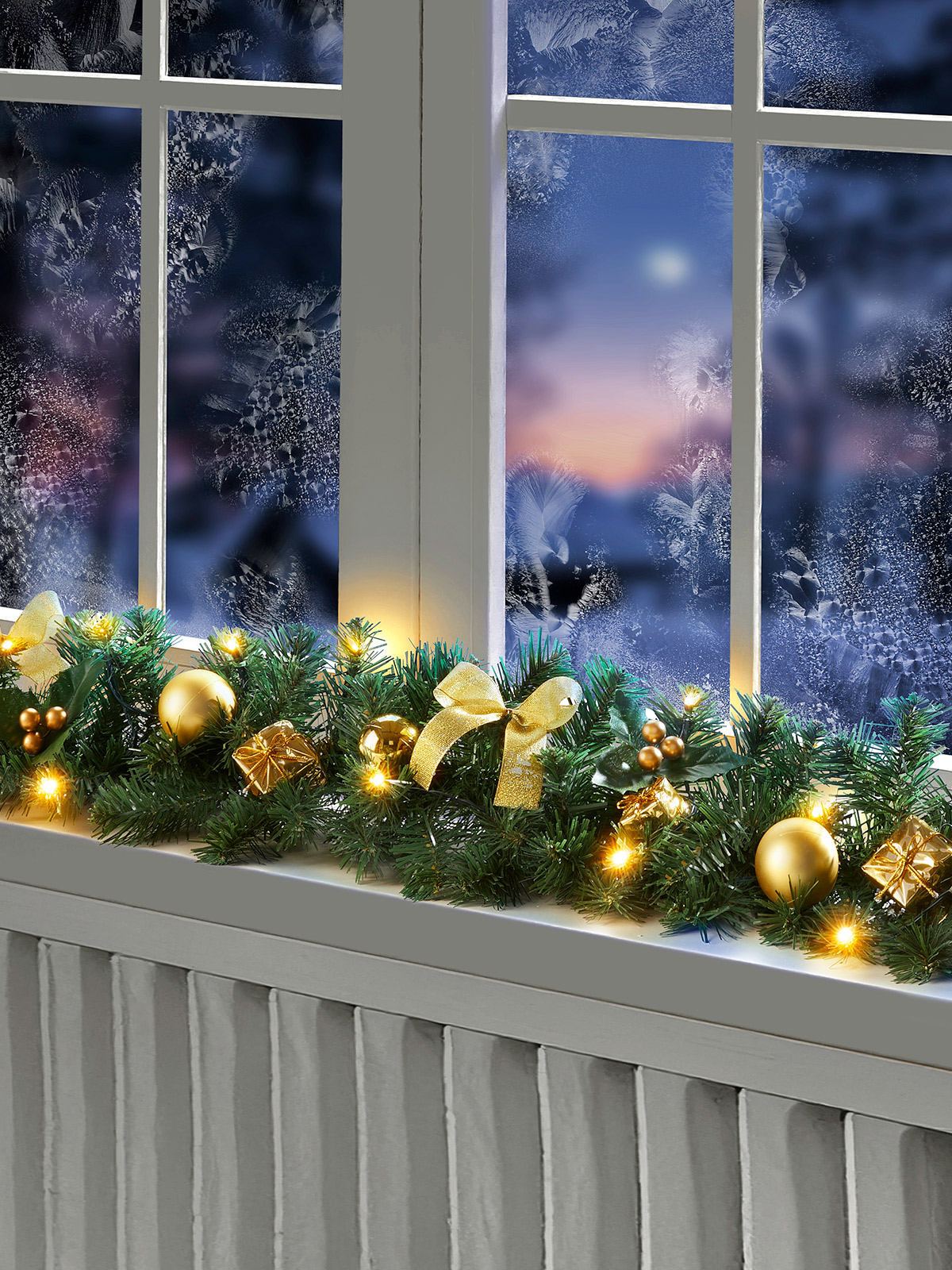 Goldig-leuchtend – für einen glänzenden Auftritt! Dieser weihnachtlicher Kranz verschönert Ihr Zuhause: Auf Rattan gebunden und reichlich mit vergoldeten Elementen sowie einer LED-Lichterkette geschmückt, ist er über und über mit reichlich Tannengrün, Zapfen, zwei goldenen Kugeln und Schleifen dekoriert. Batterien: 2 x AA (nicht im Lieferumfang enthalten). Material: Polyester und Kunststoff. Ø ca. 26 cm.