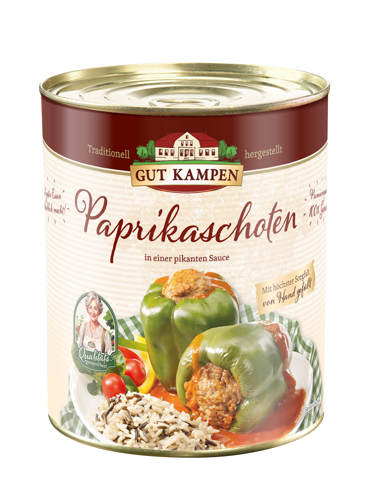 Mit viel Liebe von Gut Kampen zubereitet. 2 grüne Paprikaschoten mit feiner Schweinefleisch-Füllung in einer pikanten Sauce. Nur aufwärmen und schon können Sie genießen. Wir empfehlen dazu eine herzhafte Wildreismischung mit Salatbeilage und wünschen guten Appetit. 800-g-Ringpulldose.