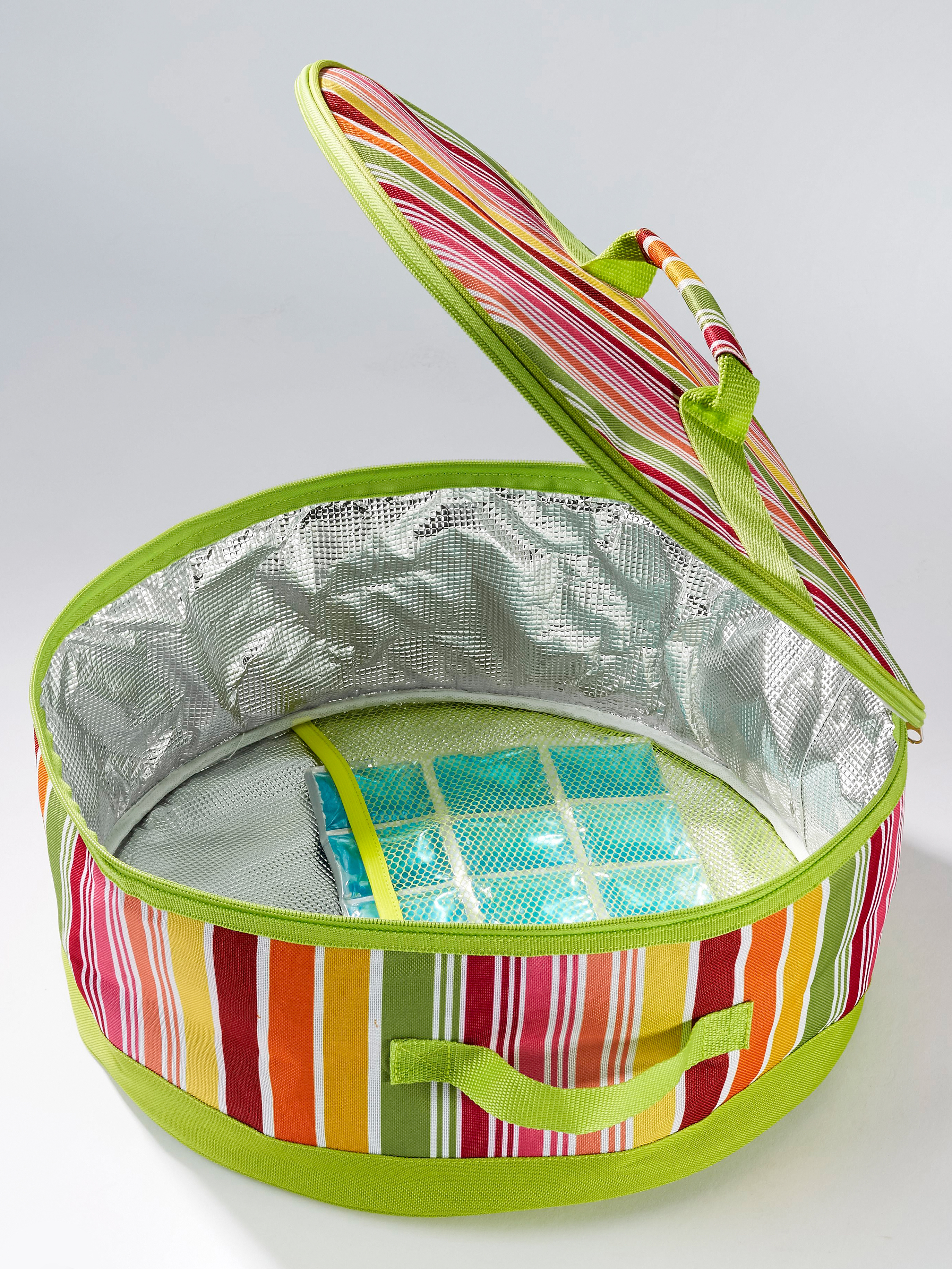 Sensationell! Die geniale Kühltaschenlösung für runde Kuchen oder Schüsseln mit Salat. Und das in herrlich fröhlichen Sommerfarben. Im Inneren befindet sich sogar ein Netz für Kühlakkus zur längeren Kühlhaltung. Der Deckel öffnet und schließt mit einem Zweiwege-Reißverschluss. Material: 100% Polyester mit Aluminium. Lieferung ohne Kühlakku. Ø ca. 38 cm. Höhe: ca. 16 cm.