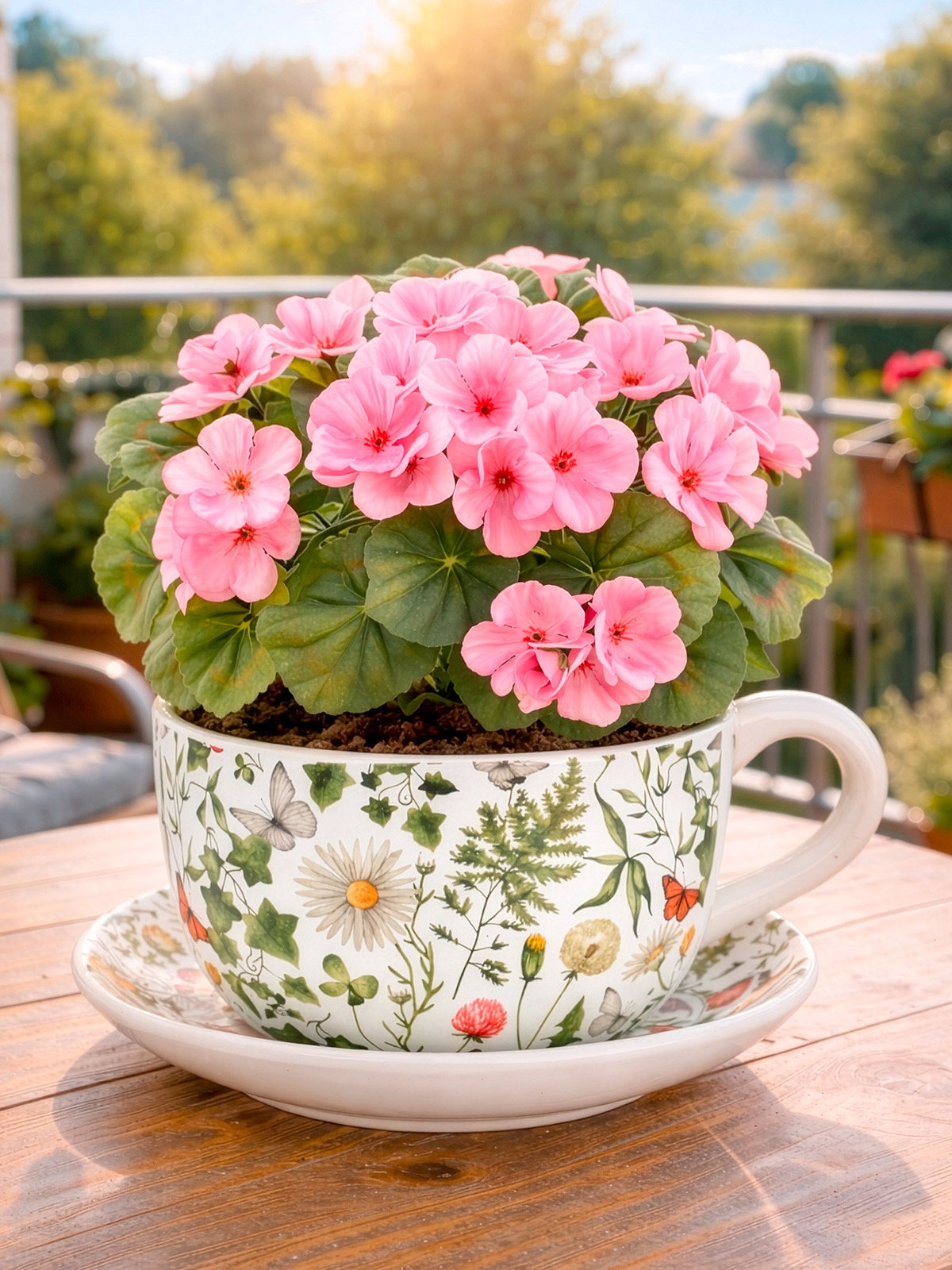 Romantisch-verspielter „Blumentopf“ aus großer Tasse mit Untertasse