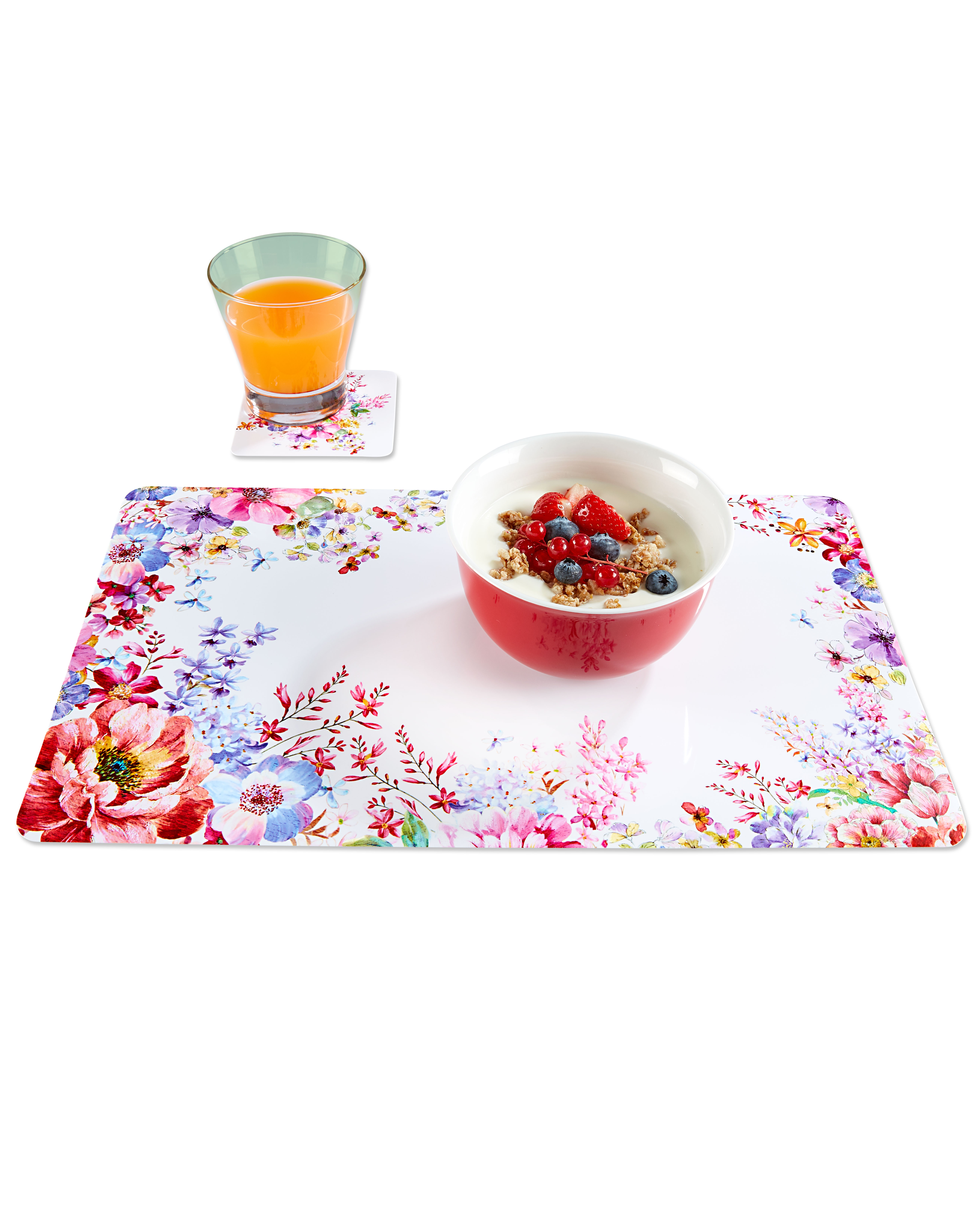 Zauberhafte Tischgäste! Bei diesen Platzsets kommt der Appetit von ganz alleine. Es besteht aus 4 Tischsets und 4 kleinen Untersetzern für Gläser. Eine einfache wie überzeugende Art, den gedeckten Tisch sauber und schmuckvoll sommerlich zu gestalten. Zum Reinigen einfach abwischen. Material: Kunststoff. Ca. 42 x 26 cm und ca. 10 x 10 cm. 8 Teile.