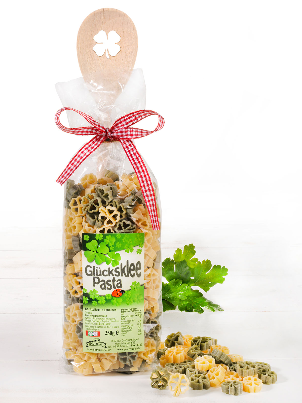 Glücksklee-Pasta nur für Dich! Kleeblatt-Motiv-Nudeln zum Teil mit Spinat verfeinert. Diese wunderschönen Kleeblätter bringen garantiert Glück auf den Teller. Mit „Glücksklee“- Kochlöffel und Schleife verpackt. 250 g.
