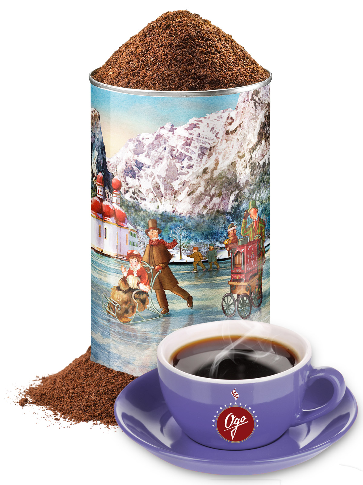 Limitierte Künstlerdose zum Sammeln & Genießen: Das historisch-bunte Treiben auf dem vereisten Königssee vor der Kulisse von Schloss und Wallfahrtskirche St. Bartholomä und den verschneiten Bergen bildet das malerische Panorama für unsere neue Lieblingsdose. Gefüllt mit meisterlich geröstetem Festkaffee aus hochfeinen Arabica-Bohnen. Nicht im Rahmen eines GOLD-Abos nutzbar. 2 x 250-g-Dose + 1 x 250-g-Dose GRATIS.