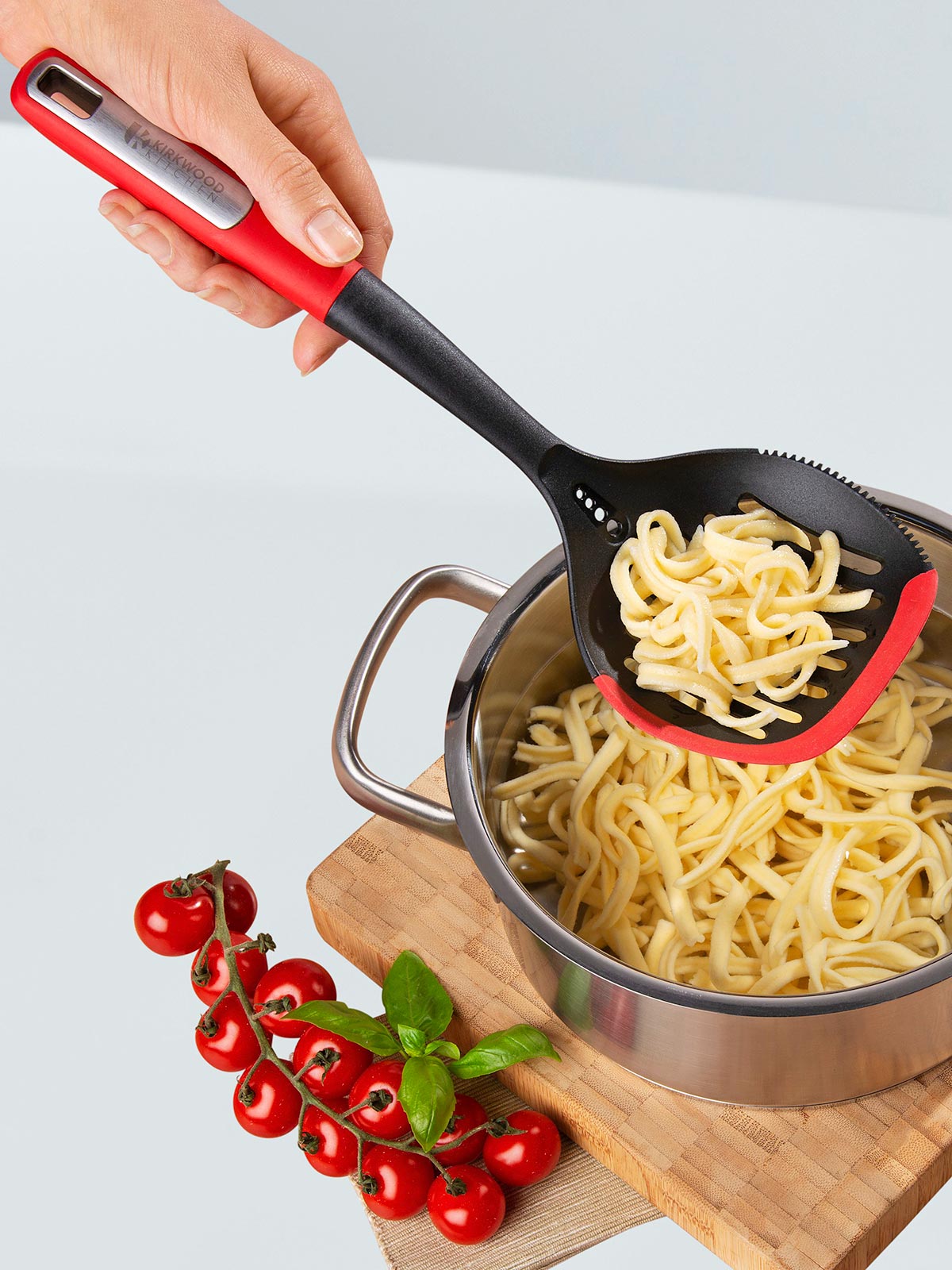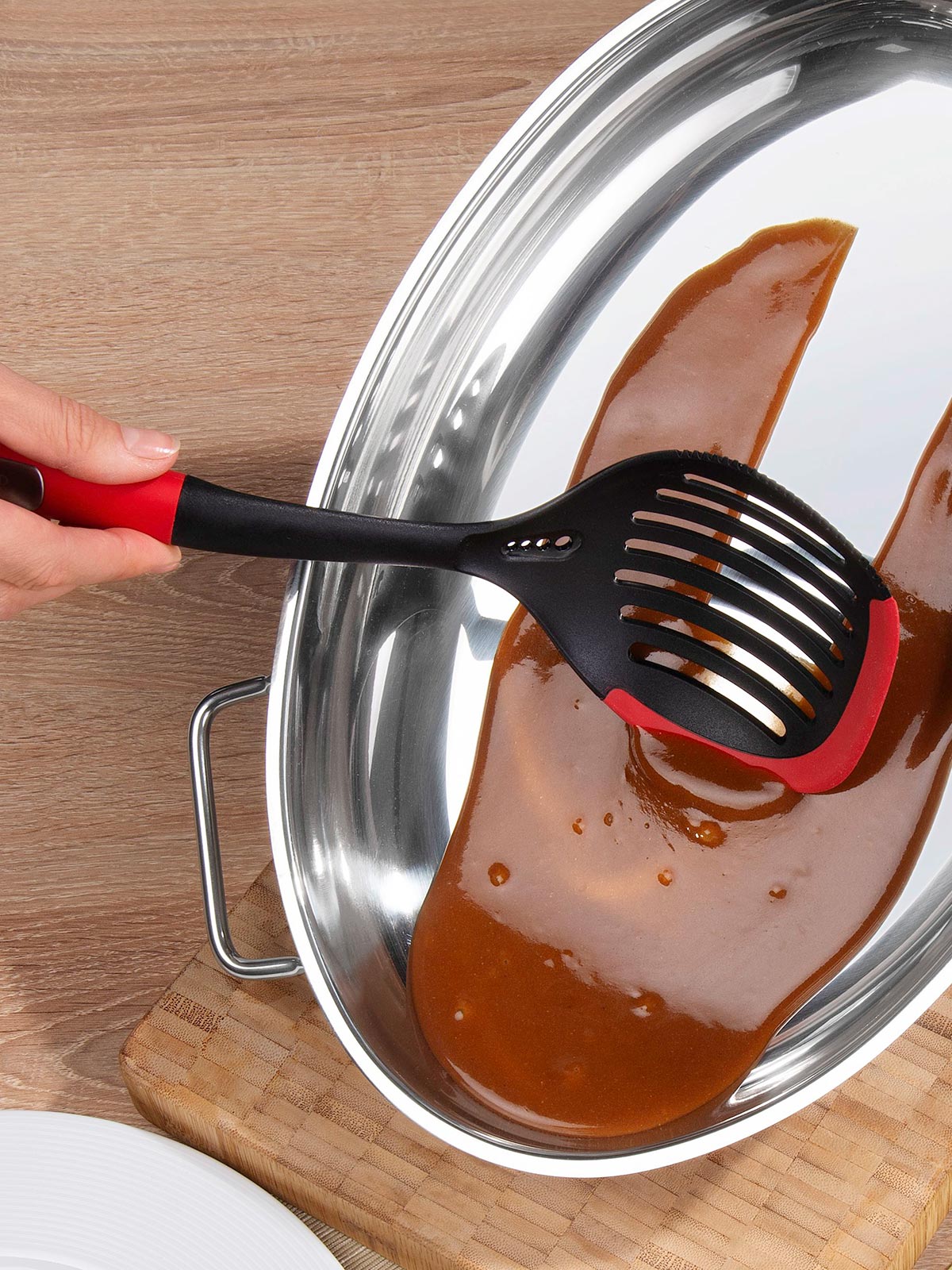 Ein unerschöpfliches Talent! Sparen Sie sich unzählige Küchenhelfer und setzen Sie auf den Alleskönner. Der raffinierte Schaumlöffel bietet sich sowohl zum Servieren als auch zum Abschöpfen an. Gleichzeitig kann er mit der Kante schneiden und mit der integrierten Lippe schaben. Durch die Lochung im Stil lassen sich ganz einfach frische Kräuter strippen. Spülmaschinengeeignet. Material: Silikon, Kunststoff. Länge: ca. 34 cm.