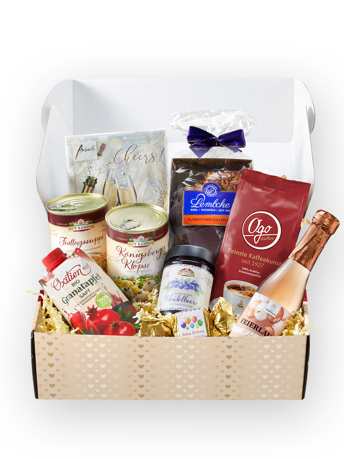 Geburtstags-Happen: Zucker, Kakaobutter, Kakaomasse, Vollmilchpulver, Johannisbeermark, Butterreinfett, Feuchthaltemittel: Sorbit; Ethanol, Marc de Champagne, Aroma, Weizenkorn, Emulgator: Lecithine (Soja); Säuerungsmittel: Citronensäure; natürliches Vanillearoma.