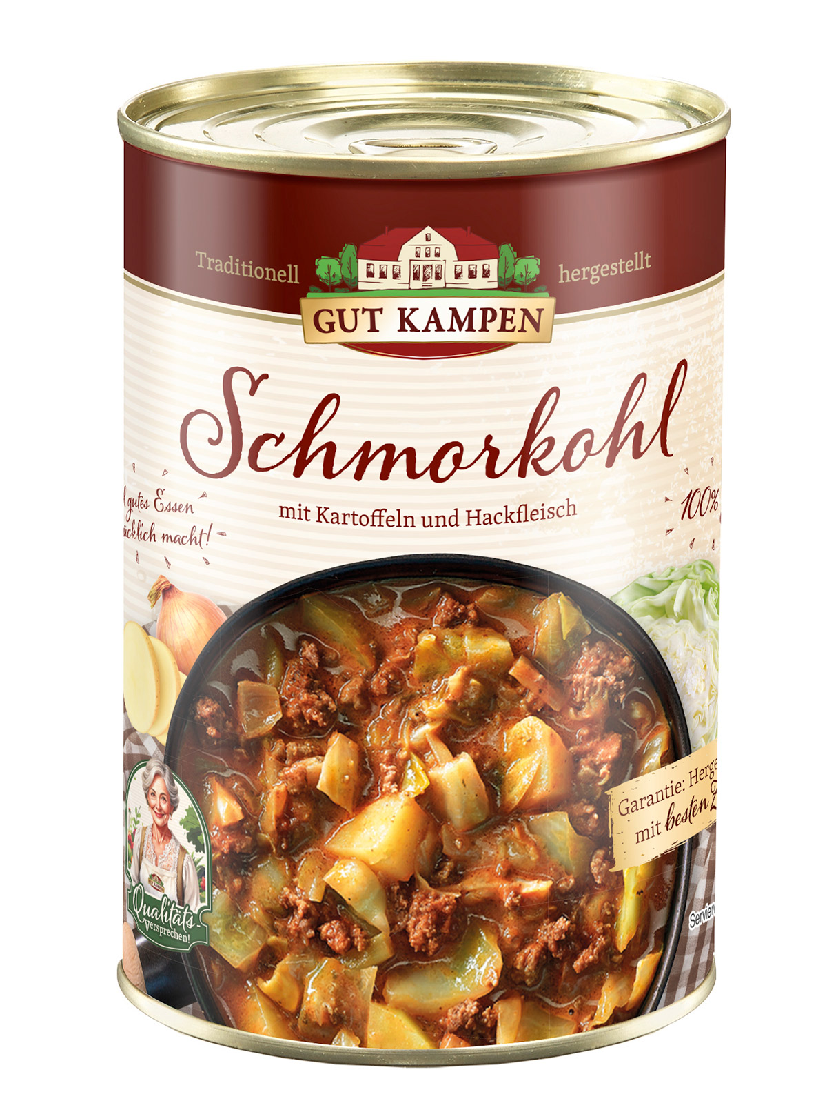 Was lange schmort, wird superköstlich! Bei Gut Kampen wird nach Omas Rezept frischer Weißkohl mit viel Schweinehackfleisch, Zwiebeln, Speck, Kartoffeln und Sahne so lange gekocht, bis das einzigartige Schmoraroma entsteht. In der 400-g-Ringpulldose.