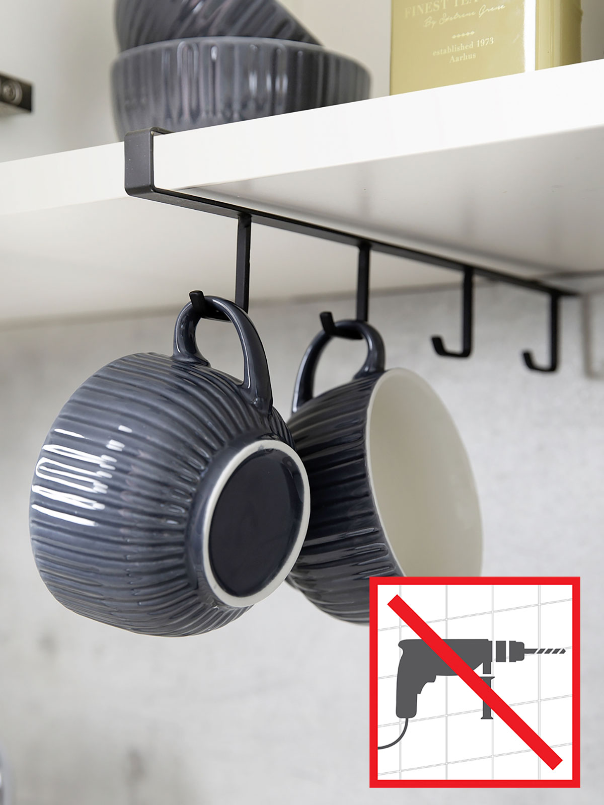 Genial! Für Ordnung und zusätzlichen Stauraum im Küchenschrank. Der moderne Schrankeinhänger für die Küche bietet Platz für bis zu 4 Tassen und kann einfach an einem Regalfach bis 17 mm eingehängt werden. Mit rutschsicherer Aufhängung. Material: Metall. Länge: ca. 33 cm.