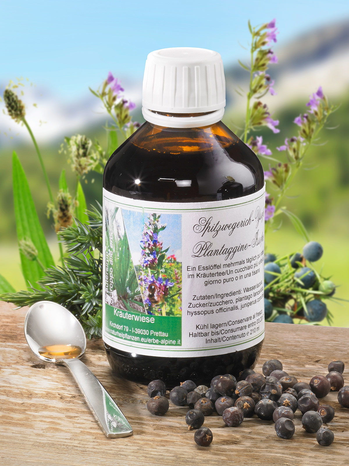 Der Klassiker aus Spitzwegerich, Ysop und Wacholderbeeren kann bei Atemwegserkrankungen gut durch den Winter helfen und wird auch von Kindern gern genommen. Auch hilfreich bei Magen- und Darmbeschwerden. Nehmen Sie zwei Esslöffel des wohltuenden Sirups bis zu dreimal täglich nach Bedarf pur oder in einem Tee. 210-ml-Flasche.