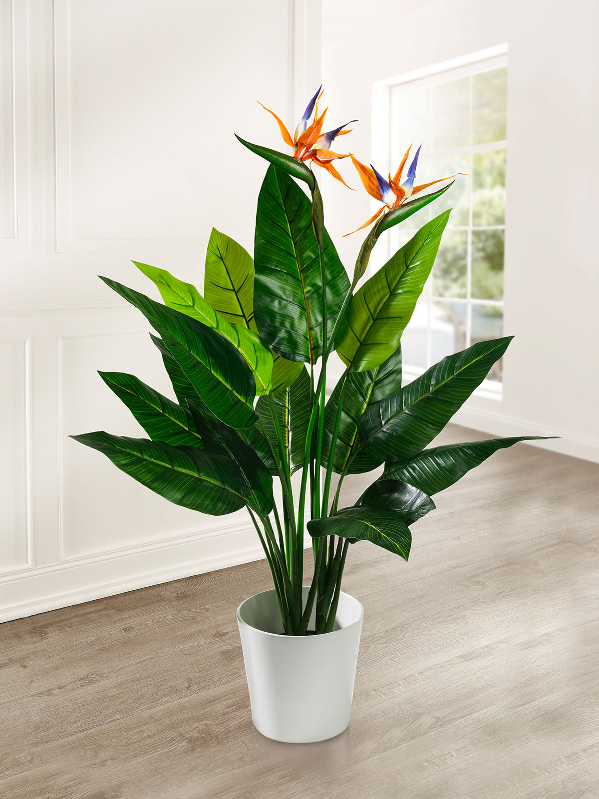 Perfekt nach dem Vorbild der Natur gearbeitet. Die imposanten, naturgetreuen 2 Strelitzien im üppigen Blattwerk aus täuschend echtem Kunst- und Textilmaterial bleiben das ganze Jahr über grün. Das prächtige Arrangement ist dekorativ in einen schwarzen Topf fest eingesetzt. Ob in einer schattigen Ecke oder an einem sonnigen Platz – pflegeleichter geht es kaum! Wird in einem separaten Paket geliefert! Höhe: ca. 110 cm.