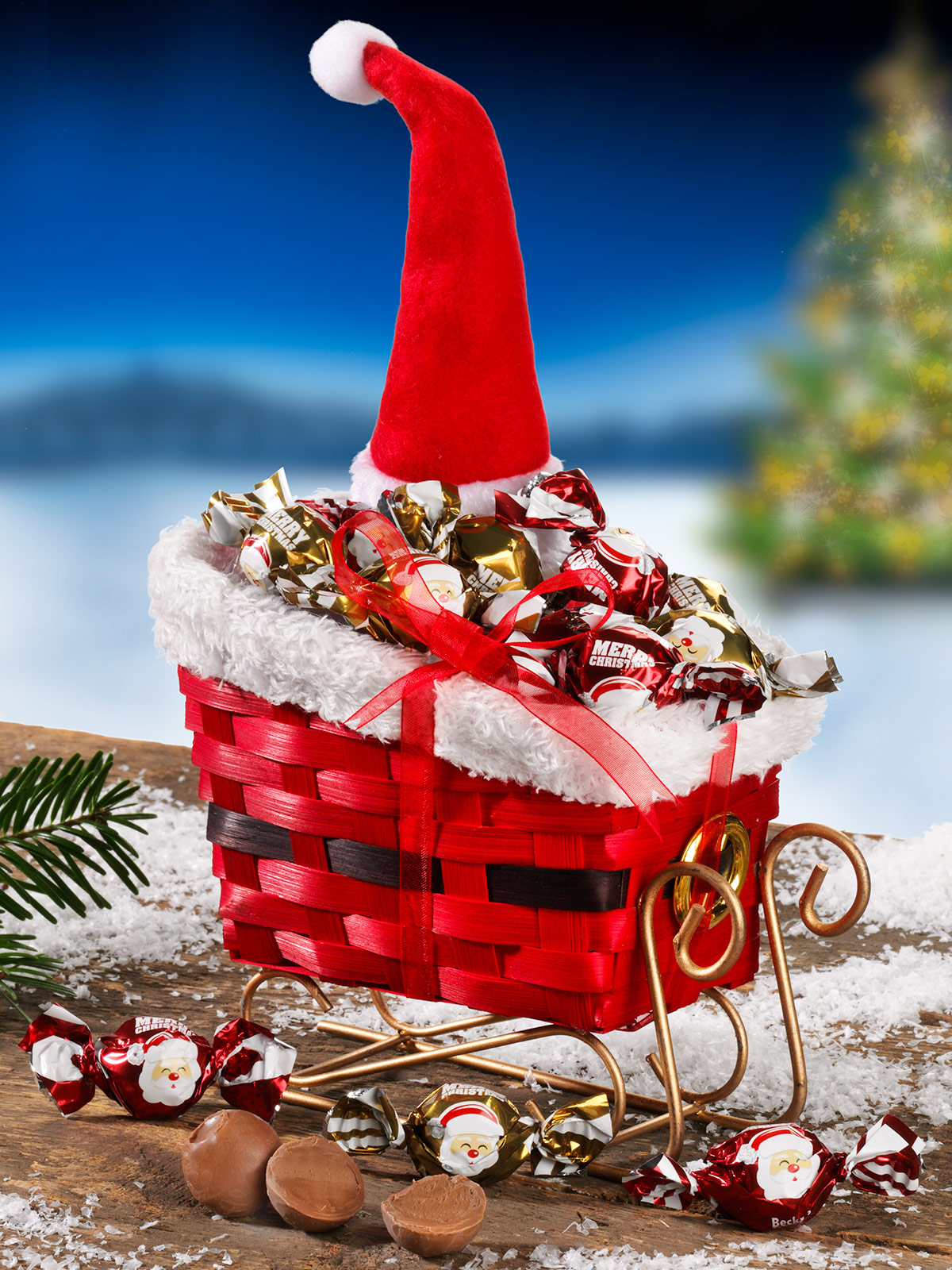 Ein ideales Mitbringsel zur Weihnachtszeit! Vier Weihnachtsmann-Tütchen gefüllt mit je 50 g Vollmilch-Schokoladen-Spaß. Tütenhöhe: ca. 10 cm.