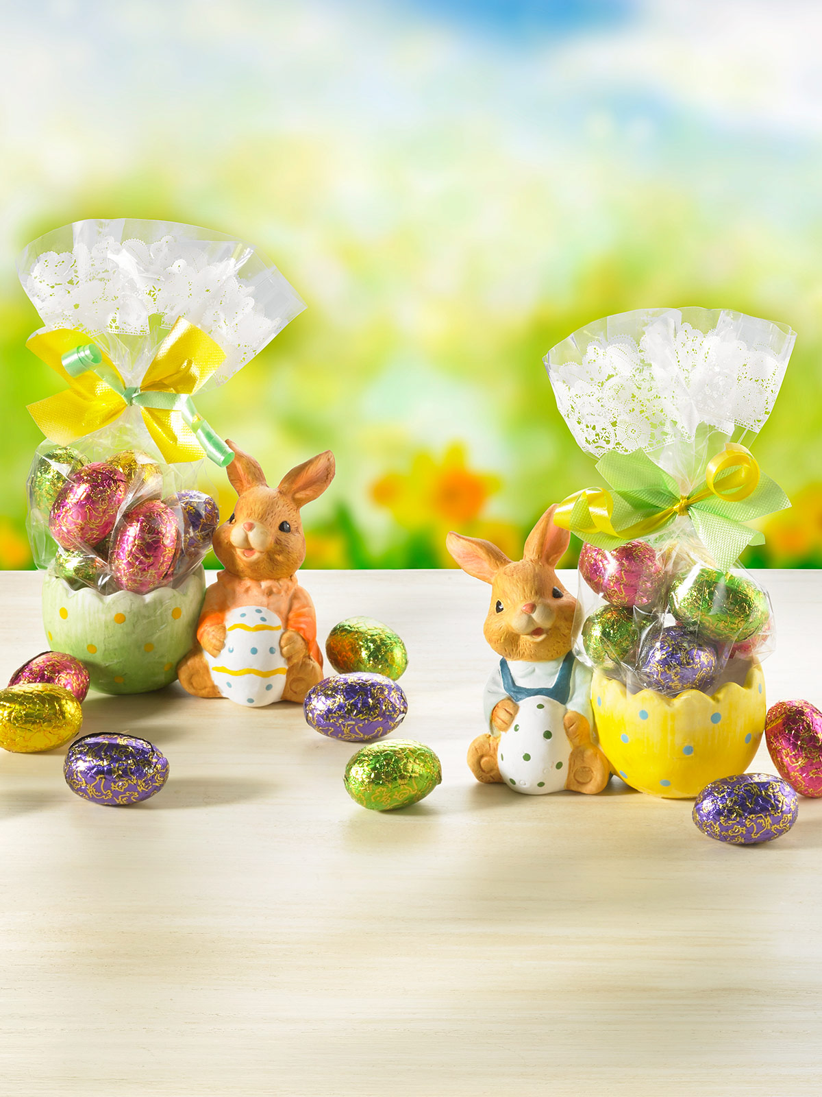 Was für ein „süßes“ Präsent! Diesen niedlichen Kätzchen kann keiner widerstehen: Die hübschen Papier-Tütchen enthalten köstliche Vollmilch-Schokokugeln mit einer verführerischen Kakaocreme-Füllung. Perfekt verpackt als kleines Präsent in Folie mit Goldschleifchen. Gesamthöhe: ca. 18 cm. 2 Stück à 50 g.