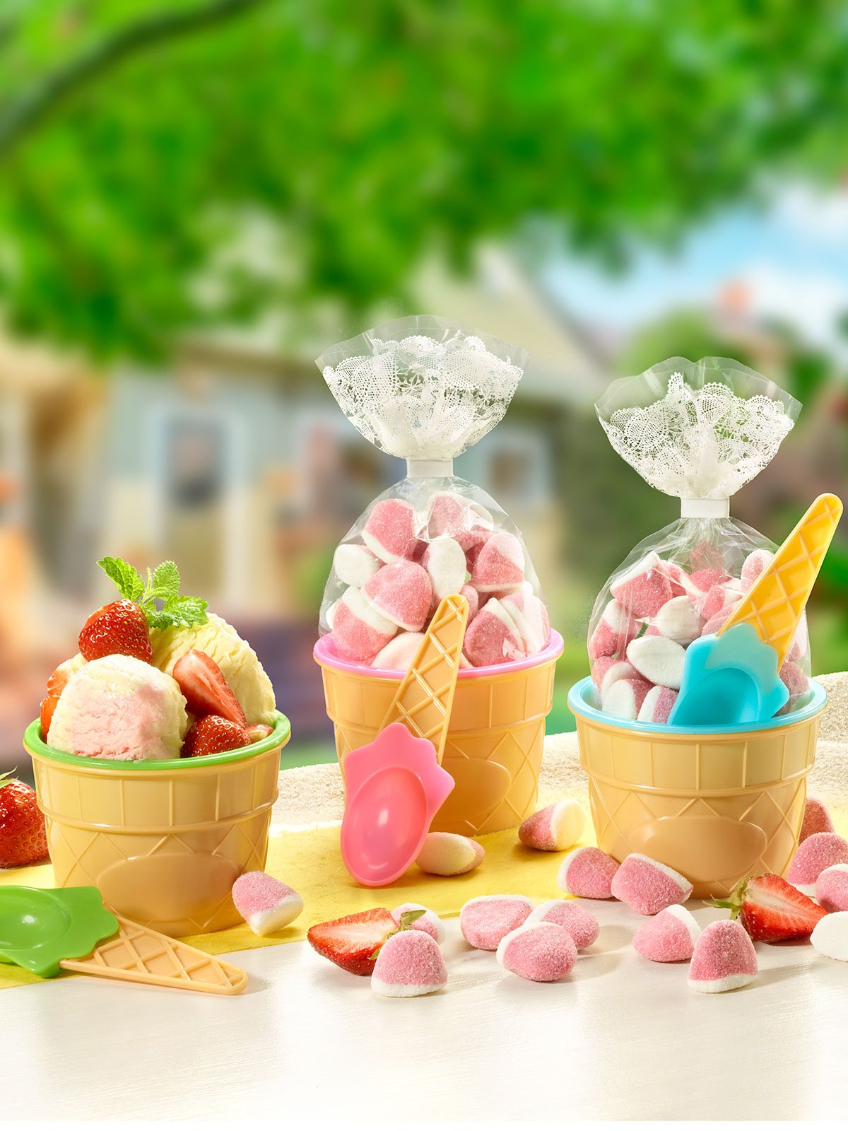 Eine großartige sommerliche Geschenkidee! Erst naschen und dann köstliches Eis aus den bunten Bechern genießen. Material: Kunststoff. Gefüllt mit jeweils 100 g Schaumerdbeeren. Ø ca. 9 cm, Höhe: ca. 7 cm. 3 Stück.