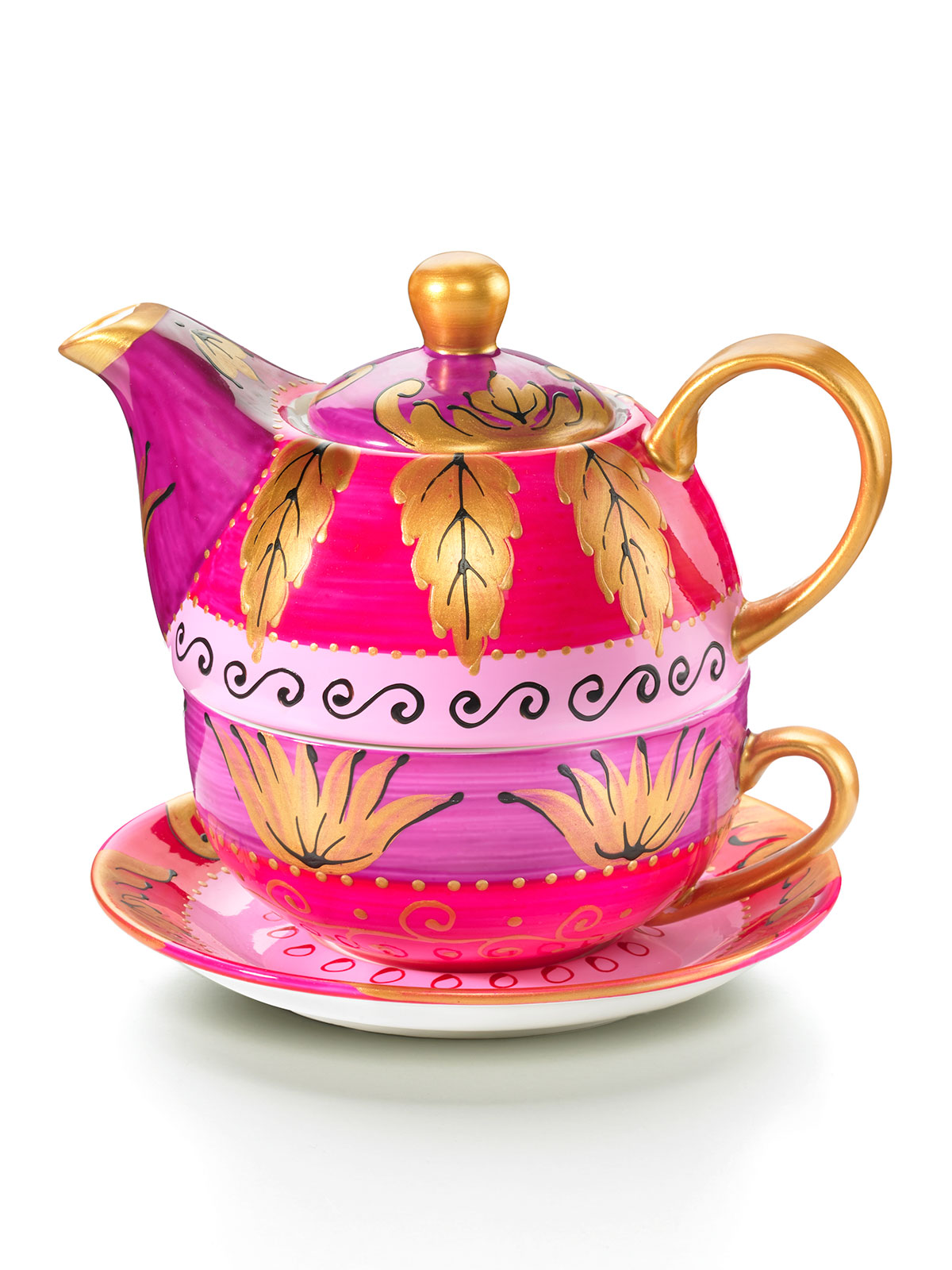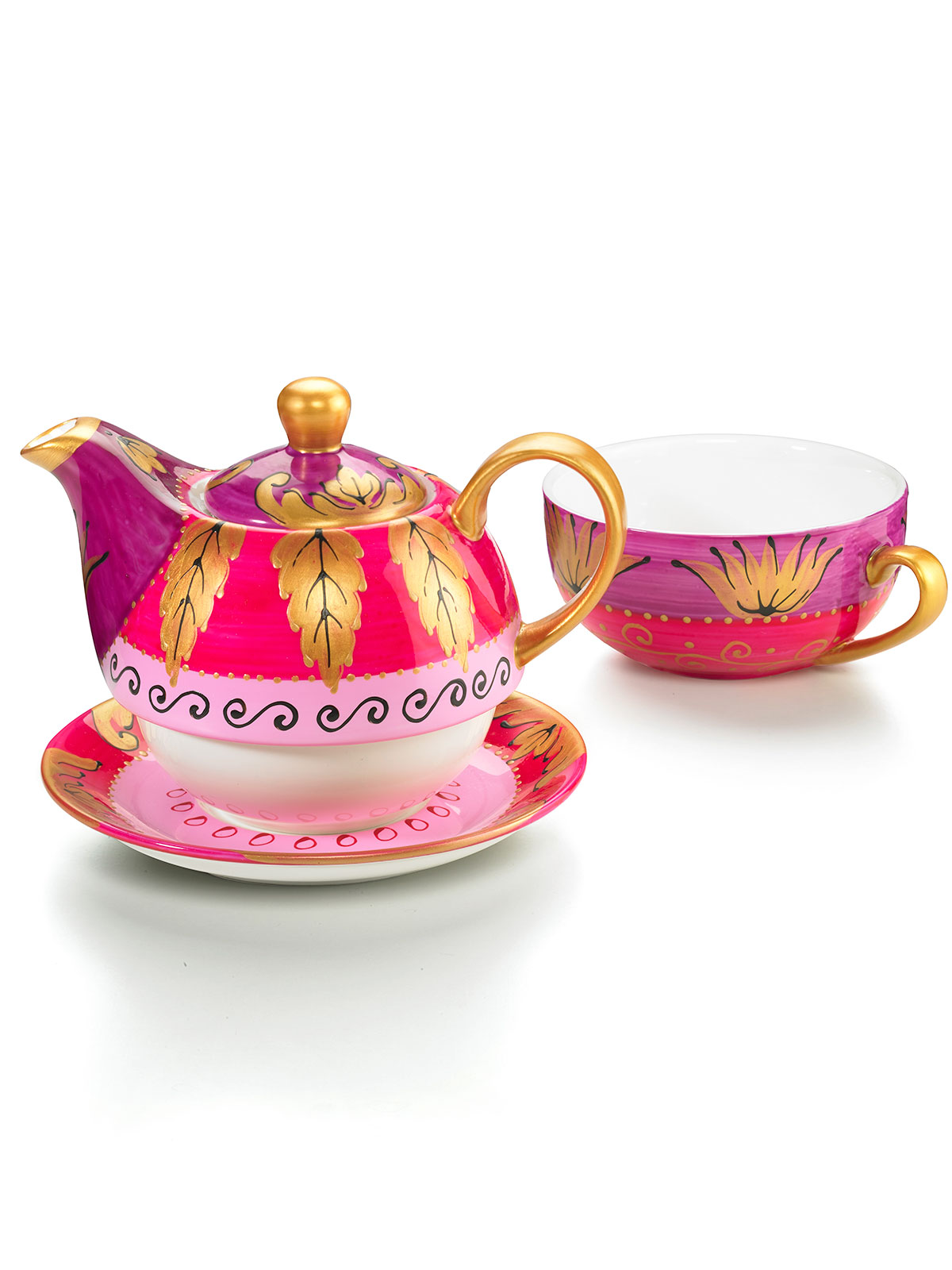 Für die gemütliche Single-Teestunde verziert ein bezaubernd schönes, handgemaltes Gold-Design das Tea for one-Set, welches den Inhalt für genau 2 Tassen bietet. Das Trio, bestehend aus Kanne, Tasse und Untertasse, ist aufeinander gestellt ein wunderschöner Blickfang in Ihrem Regal. Kanne: ca. 0,3 l, Tasse: ca. 0,17 l. Material: Porzellan. NICHT Spülmaschinen- und mikrowellenfest. Das ideale Geschenk für den Single-Teetrinker.