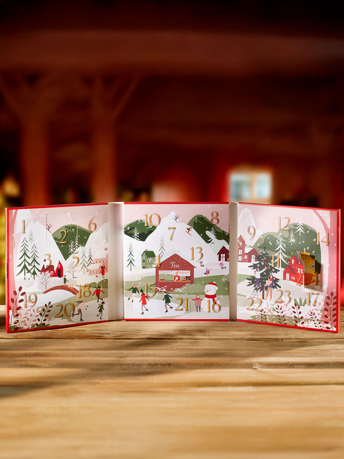 Wie ein kunstvolles Triptychon … lässt sich dieser wunderschöne Adventskalender mit der traumhaften Winterlandschaft aufstellen. Er hält für jeden der 24 Tage bis Heiligabend einen besonderen, weihnachtlich aromatisierten Schwarz-, Rotbusch- oder Grüntee in 6 verschiedenen Sorten parat. Das ist pure Vorfreude! 24 Teebeutel. 36 g.
