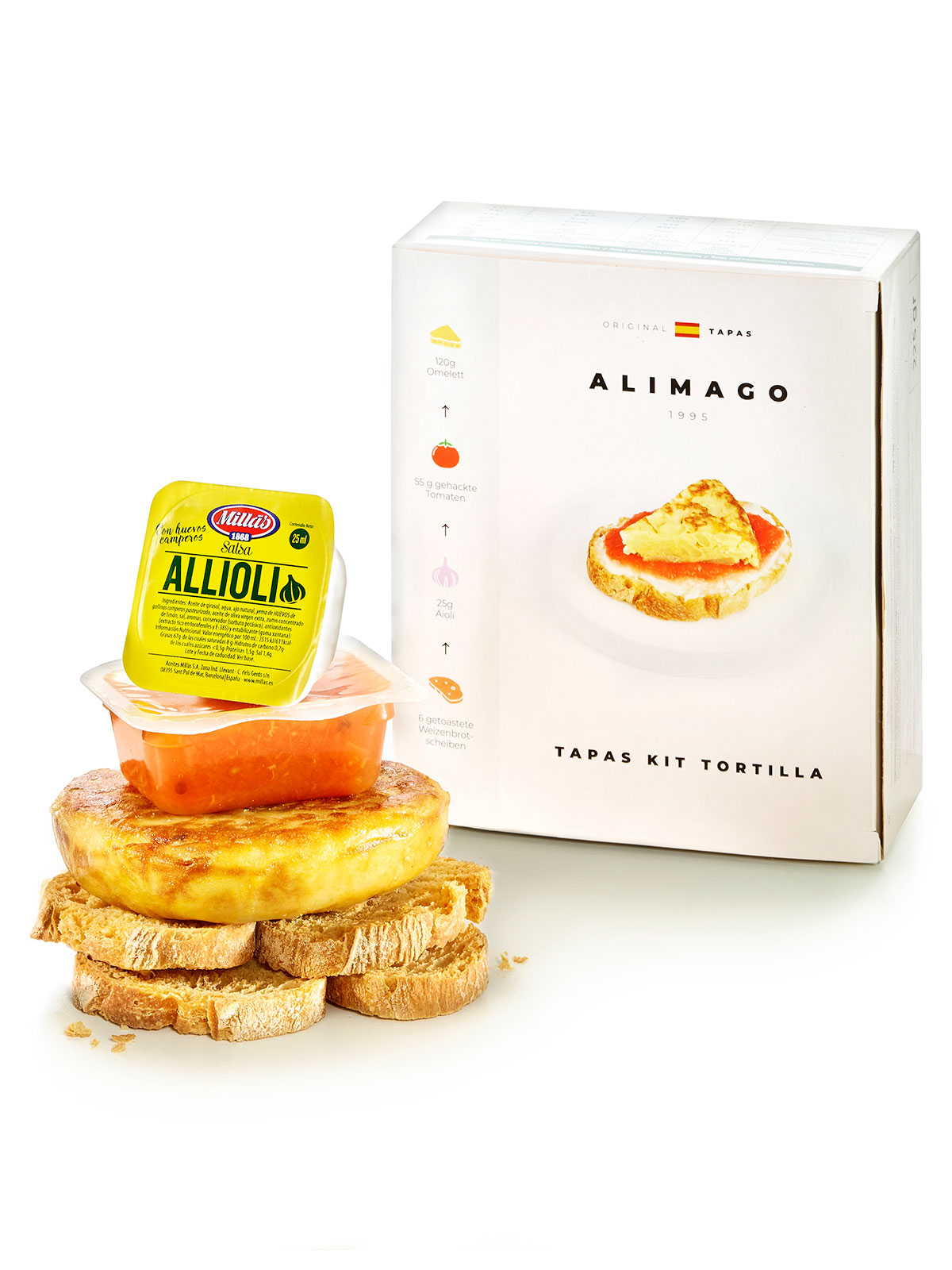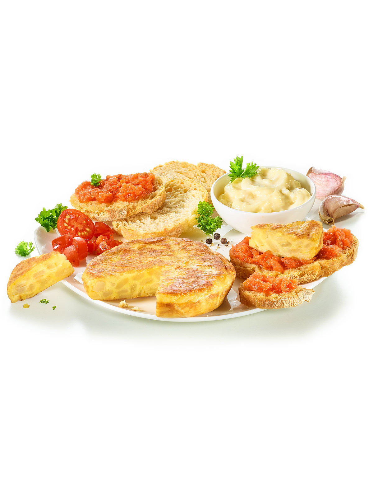 Mmmh, wie in der Tapas-Bar! Innerhalb von Minuten in der Mikrowelle oder in der Bratpfanne zubereitet und servierfertig – die perfekte, köstliche Zusammenstellung aus 120 g Omelett, 55 g gehackten Tomaten, 25 g Allioli und 6 getoasteten Weizenbrotscheiben. Mit Zubereitungsanleitung. Vakuumverpackt. Ab Versanddatum ca. 3 Wochen haltbar. 225 g.